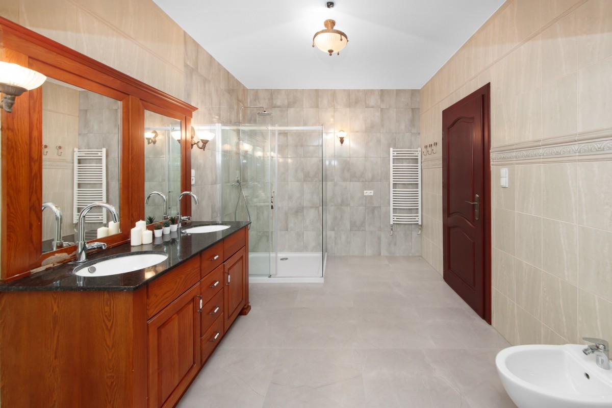 Dodatkowo wnętrze domu obejmuje 4 osobne sypialnie, trzy łazienki - w tym jedną prywatną łazienkę przynależną do głównej sypialni, a także dwa otwarte pomieszczenia zlokalizowane przy reprezentacyjnym hallu.