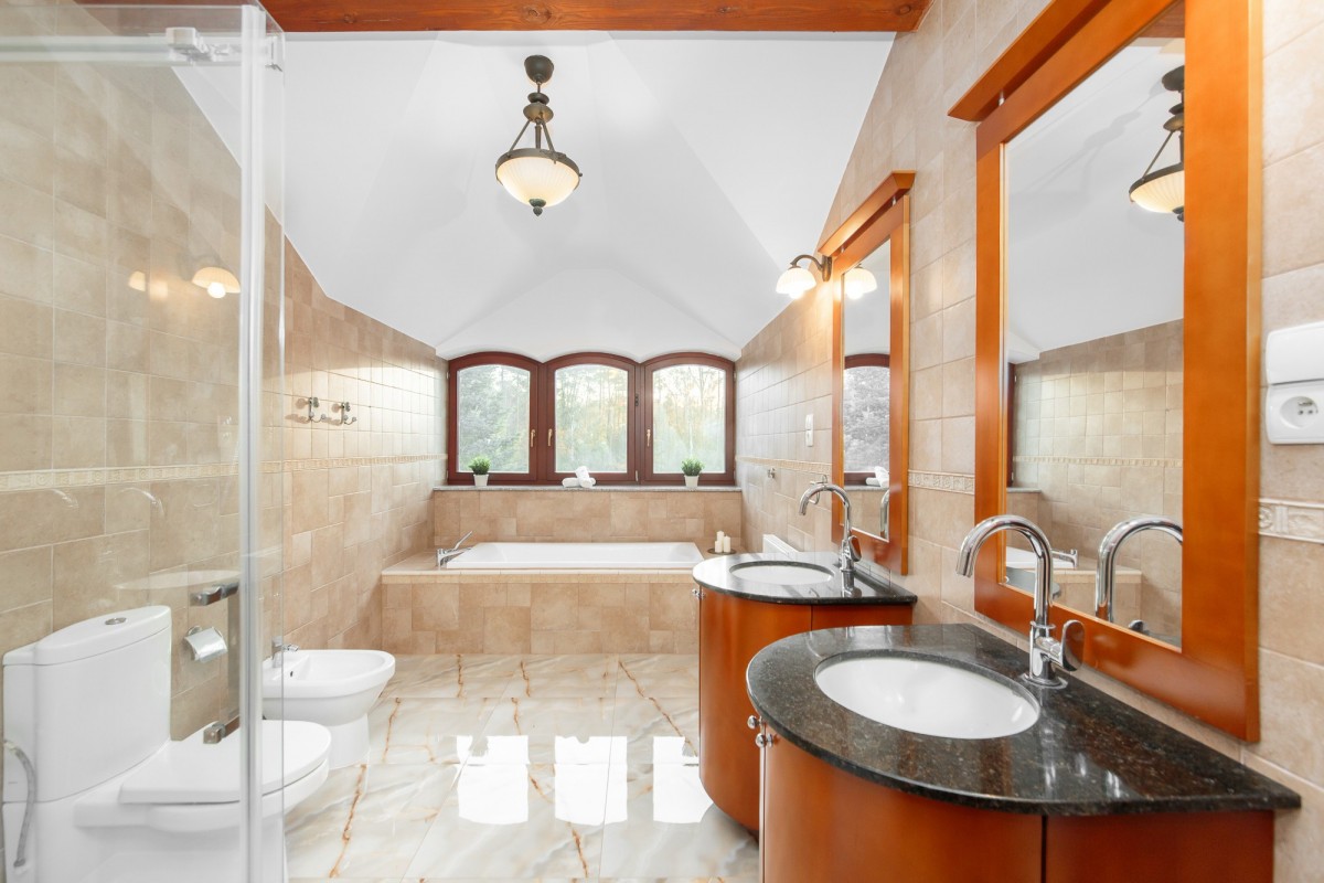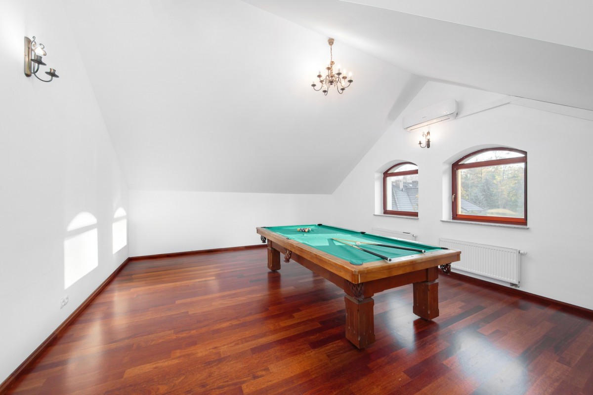 Dom oferuje dwa tarasy o różnej ekspozycji, piękny, duży ogród oraz kryty, całoroczny basen, który zapewnia komfort niezależnie od pory roku. Całość uzupełnia garaż z miejscem na dwa samochody.