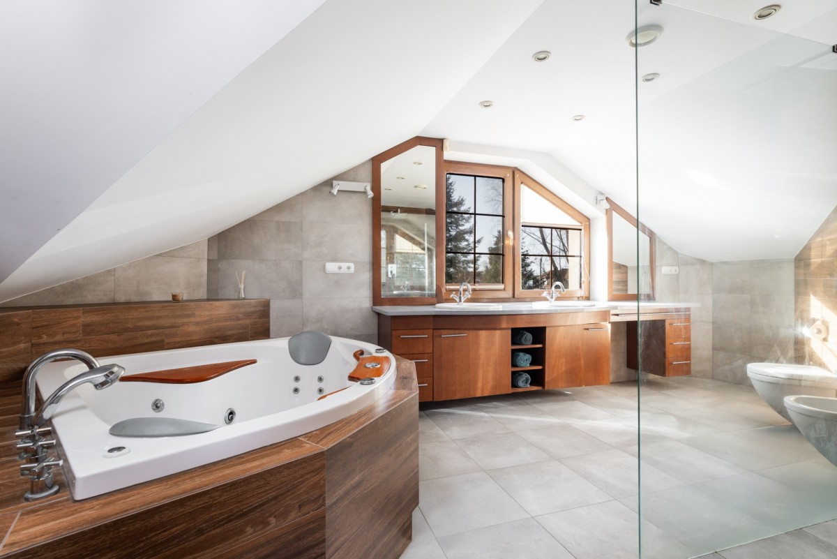* łazienka z prysznicem oraz wanną z masażem.
