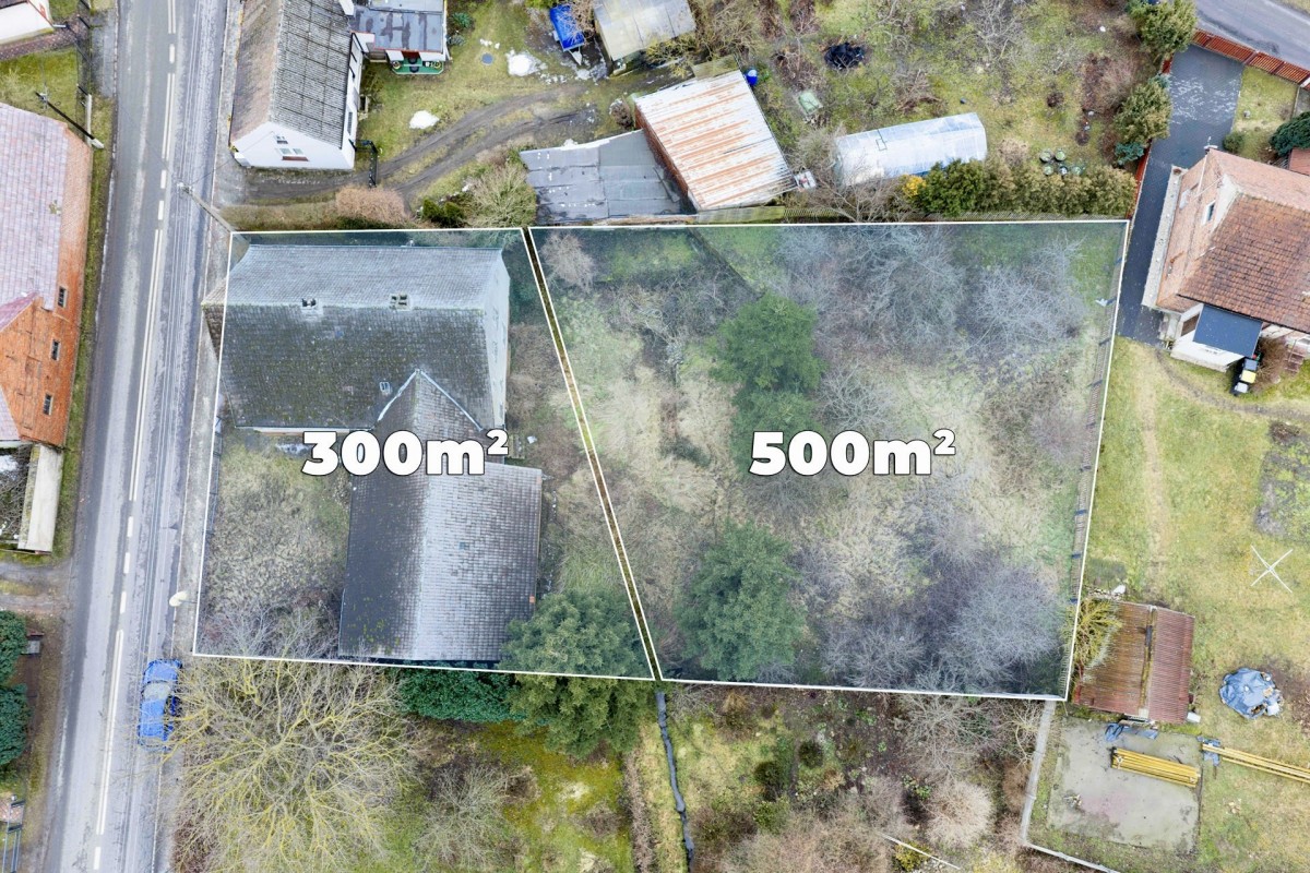 Nieruchomość usytuowana jest na płaskiej działce o powierzchni 300 m² (nr 36), z bezpośrednim dostępem do drogi publicznej asfaltowej, częściowo ogrodzona, z pojedynczymi drzewami i krzewami, które zapewniają poczucie prywatności i naturalny klimat. Sprzedawana jest łącznie z pobliską działką o powierzchni 500 m² (nr 32), która nie ma bezpośredniego dostępu do drogi.