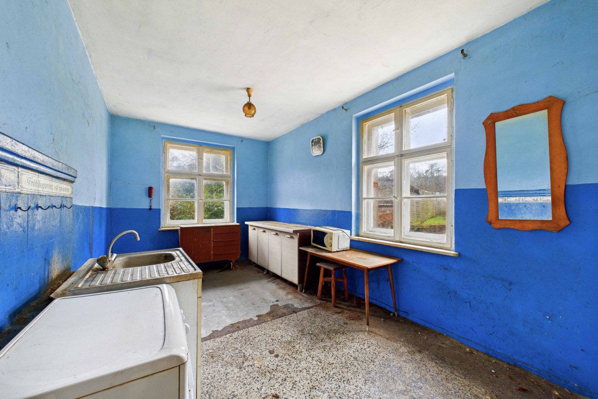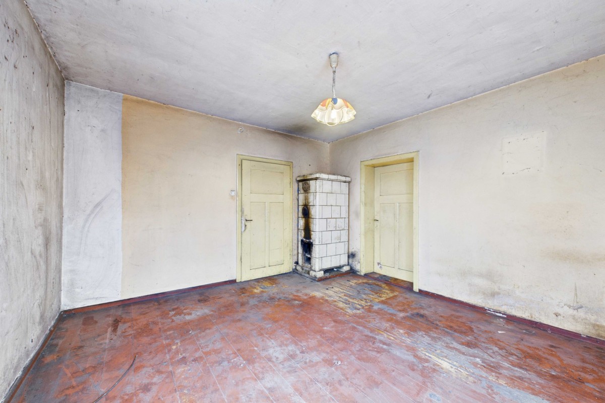 Dom o powierzchni 149,49 m² oferuje 4 pokoje, kuchnię i spiżarnię, a także użytkowe poddasze i przeznaczony jest do generalnego remontu. W pokojach stoją kaflowe piece, podłogi są drewniane. Na terenie posesji znajduje się także budynek gospodarczy - stodoła, który także stwarza szerokie możliwości na adaptację do różnych celów.