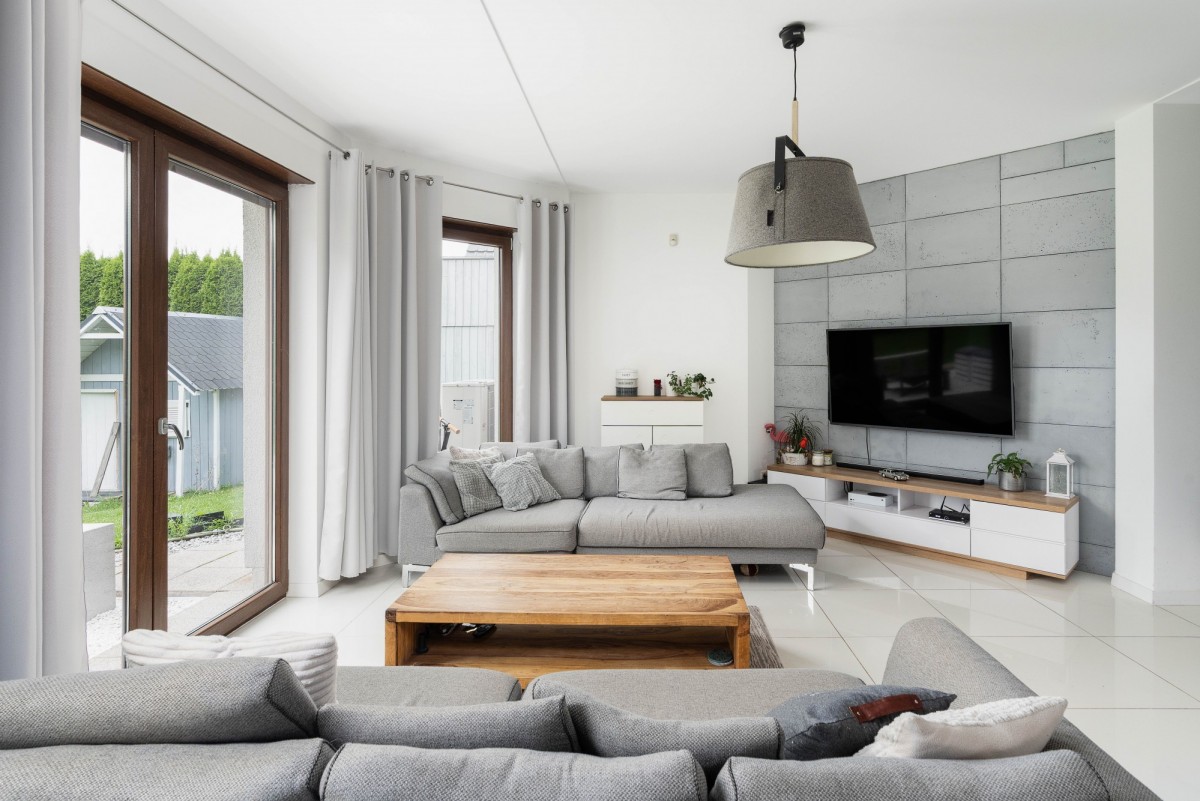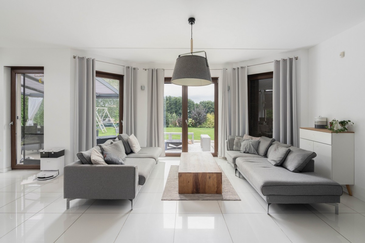 przestronny, świetnie doświetlony salon z wyjściem do ogrodu,