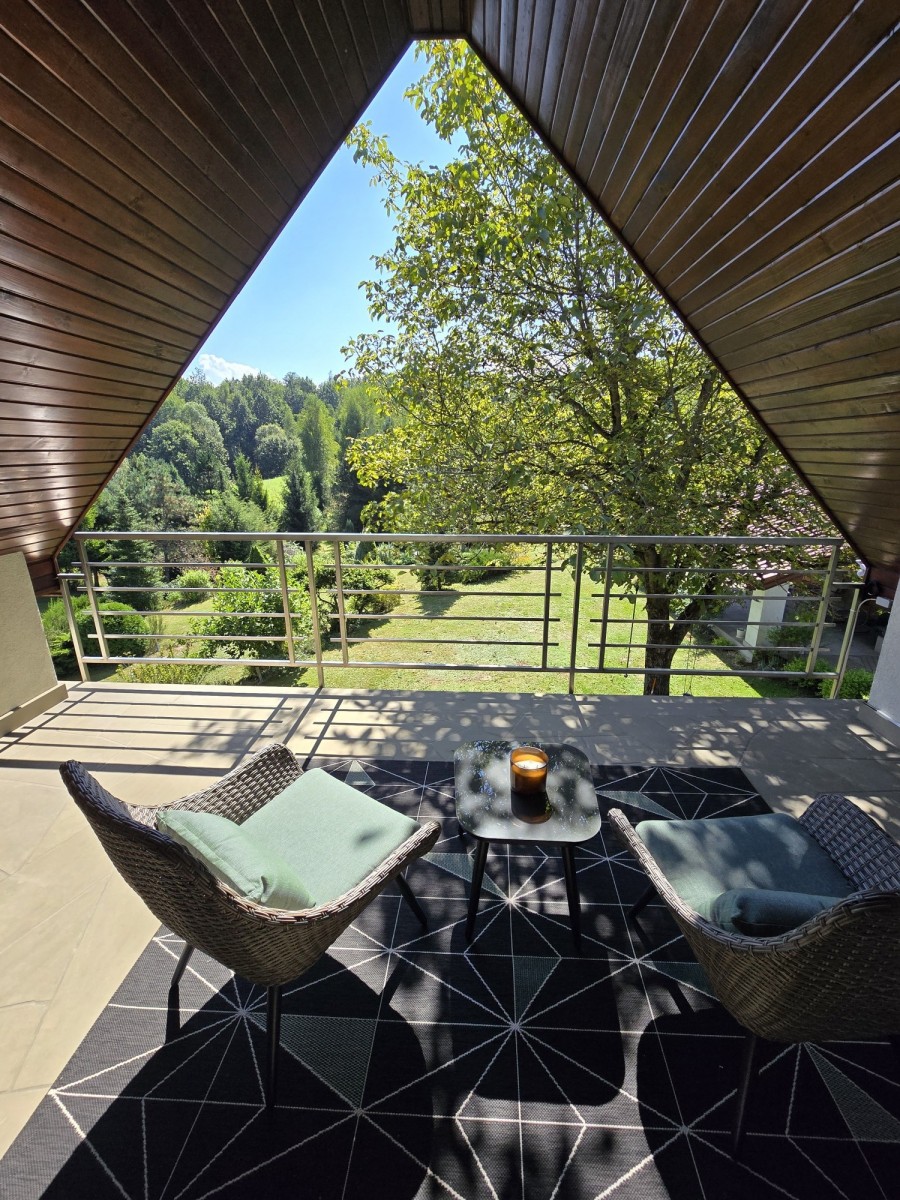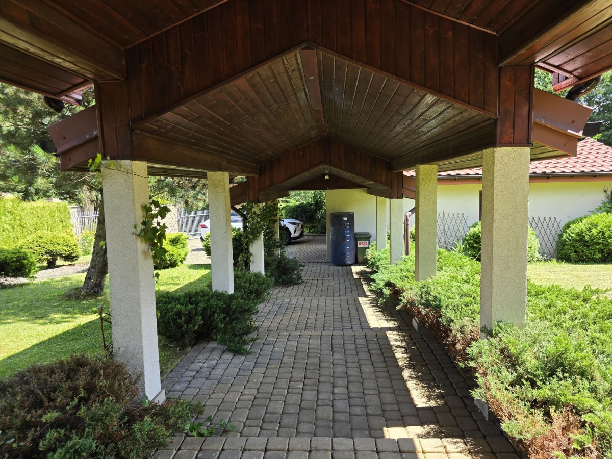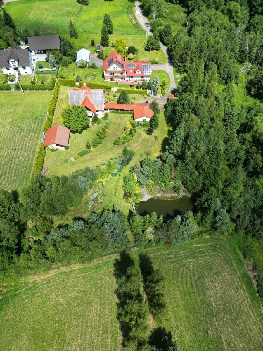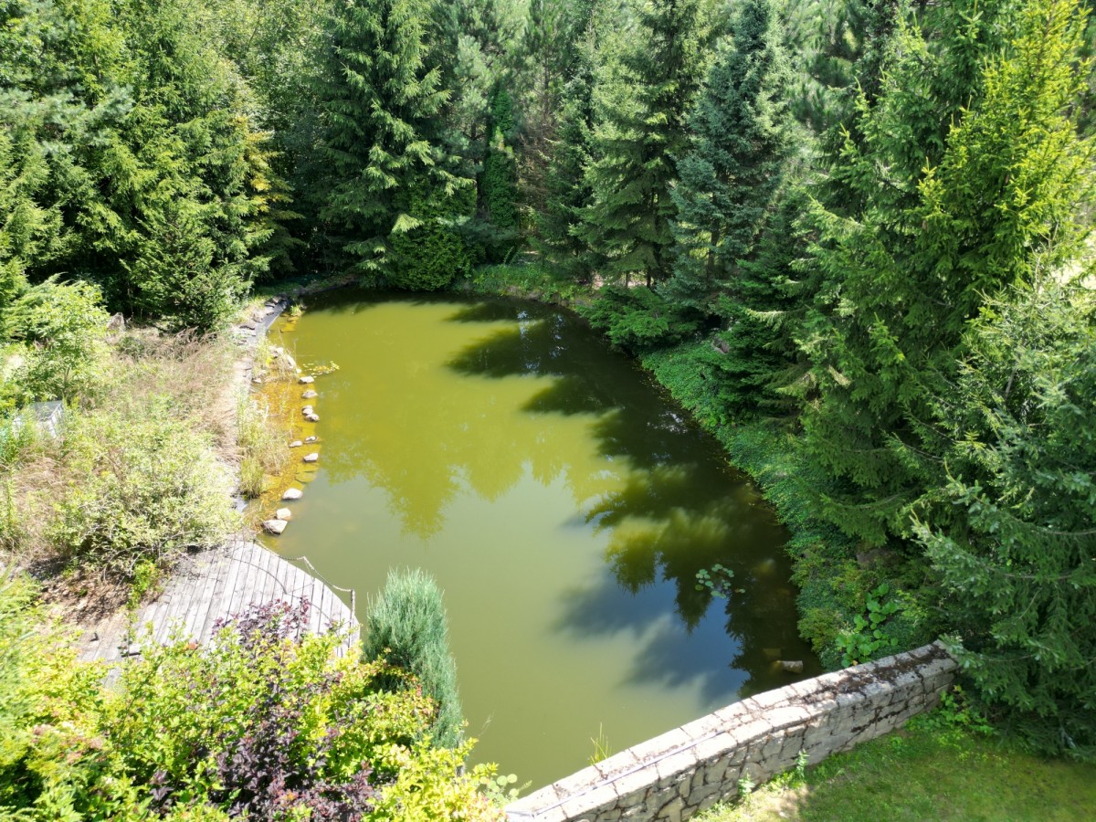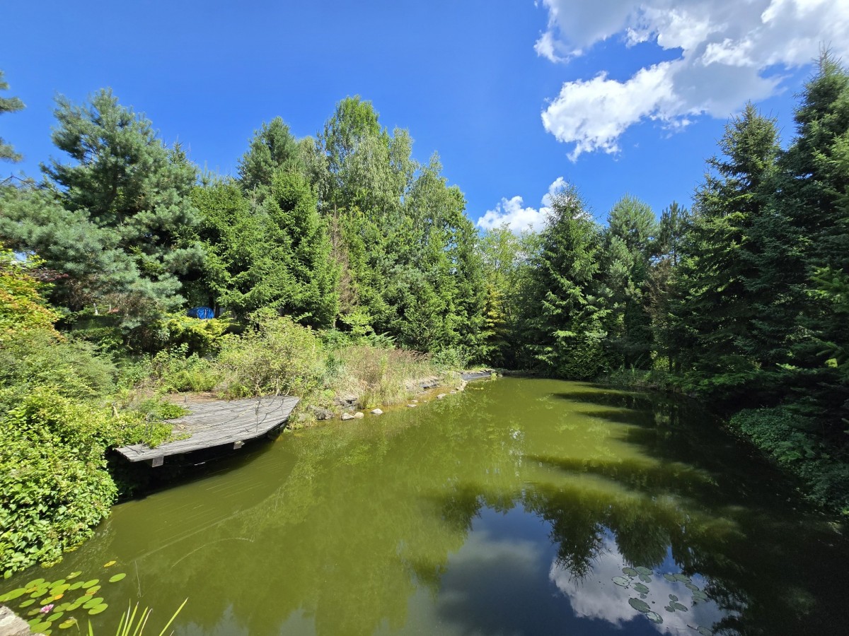Urok nieruchomości podkreśla prywatny staw (ponad 150 m²) oraz starannie utrzymana zieleń. Od strony południowej - pełna intymność, brak sąsiadów i piękny widok na otaczające tereny rolno-leśne.