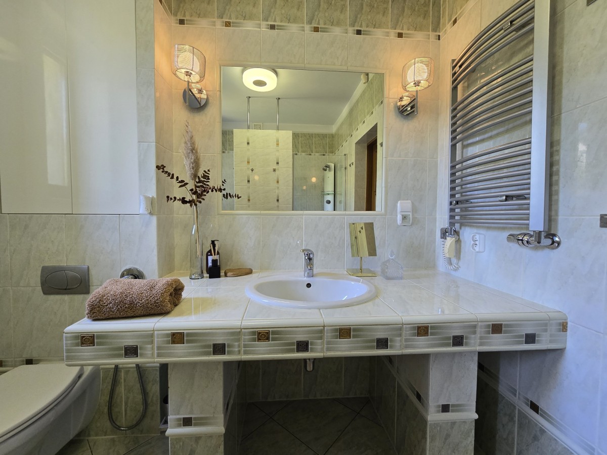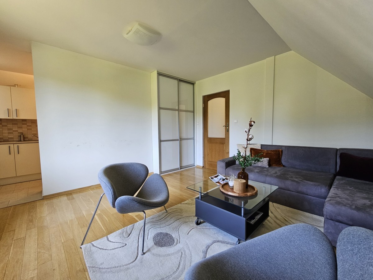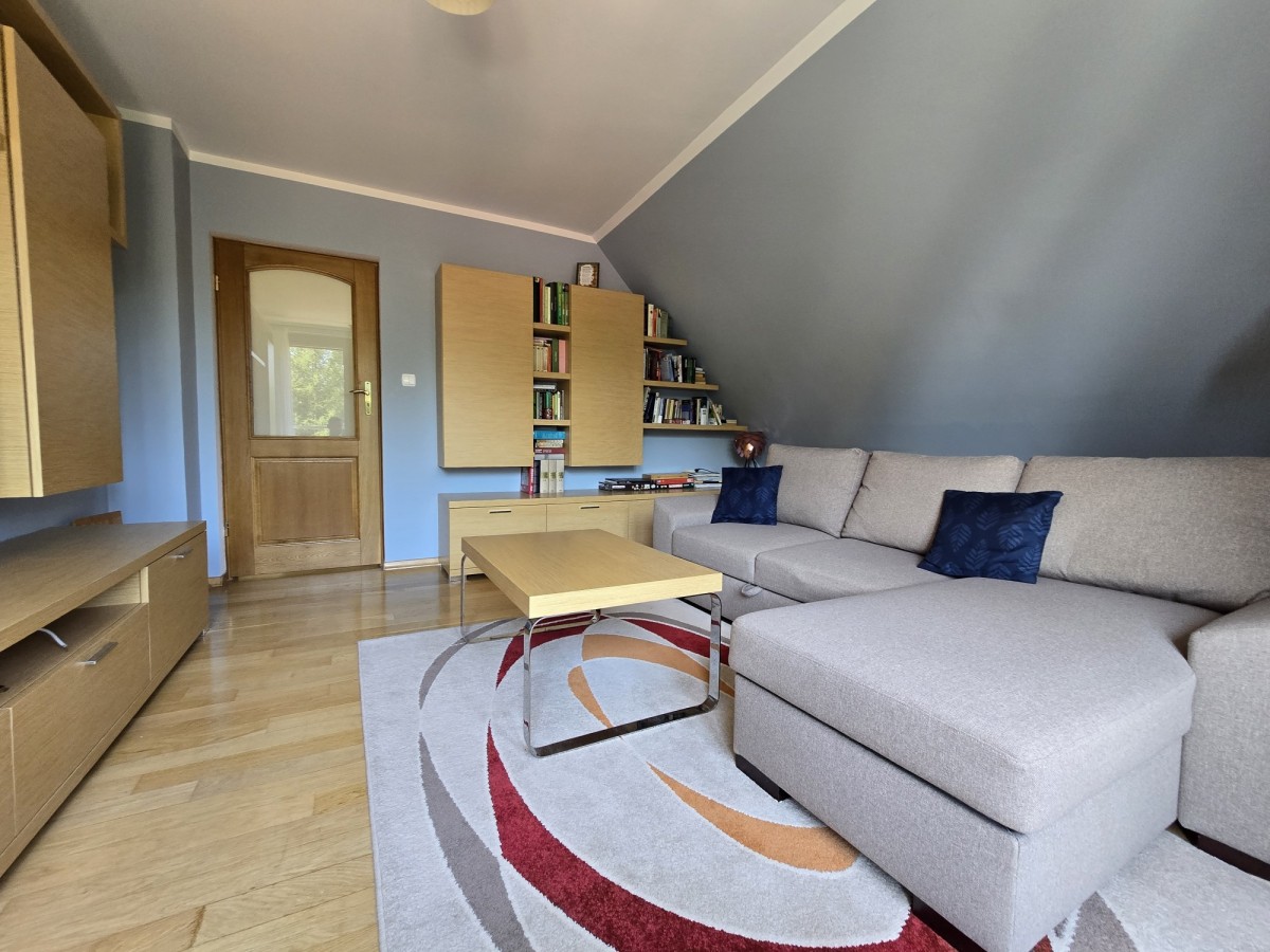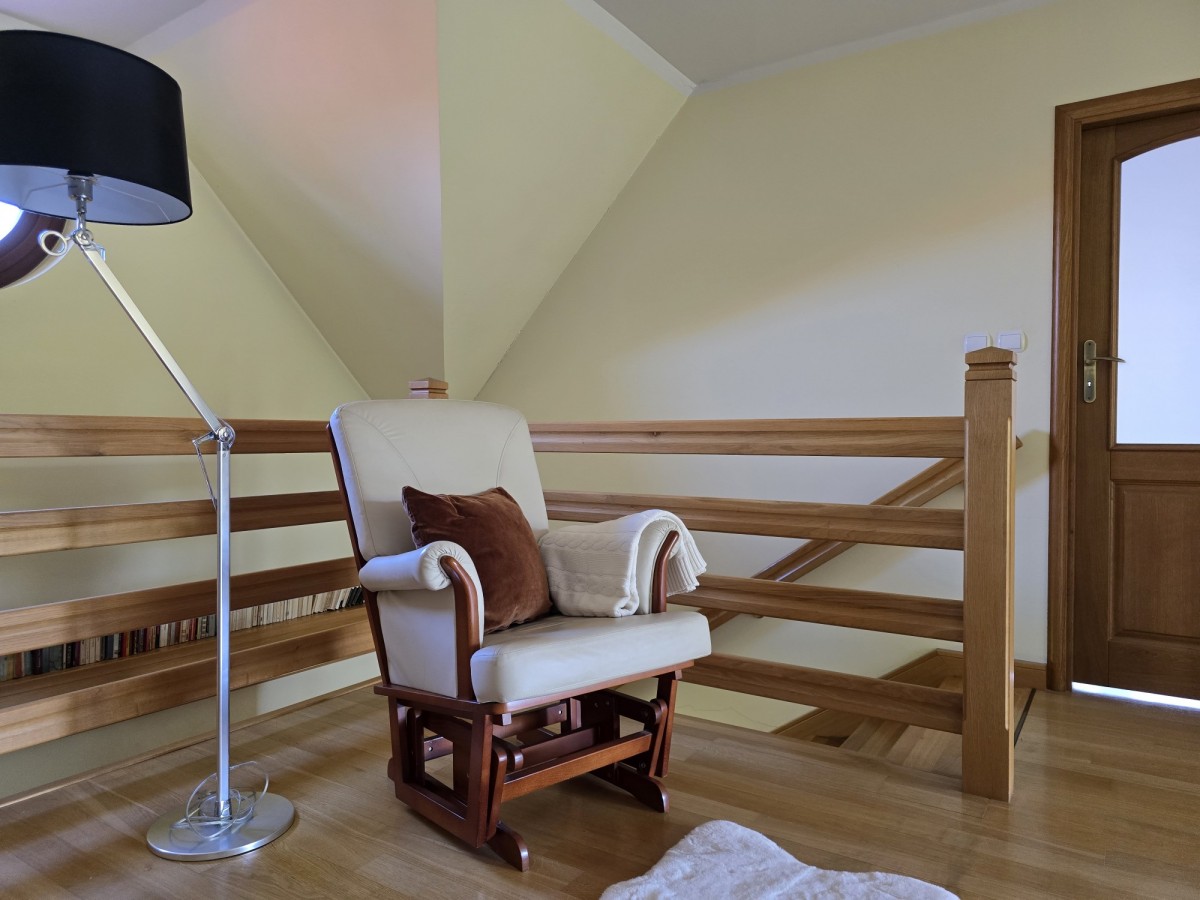 Na poddaszu znajdują się trzy przestronne sypialnie, jedna w wydzieloną kuchnią, łazienka z toaletą, oraz otwarta przestrzeń, którą można zagospodarować w dogodny dla siebie sposób, stół bilardowy lub ping pong, albo piękna biblioteczka.