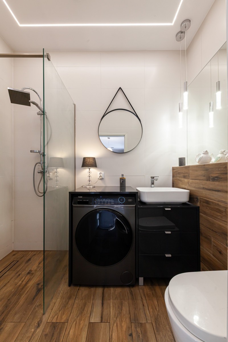 Nowoczesna łazienki mieści prysznic, pralkę i stylową umywalkę.