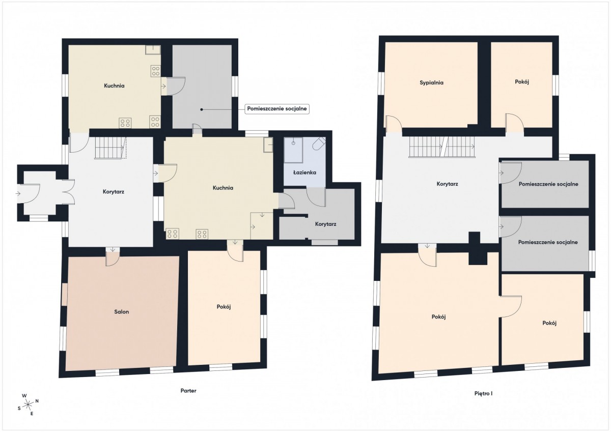 - PARTER: 2 kuchnie, łazienka, przestronny hall i 2 pokoje,