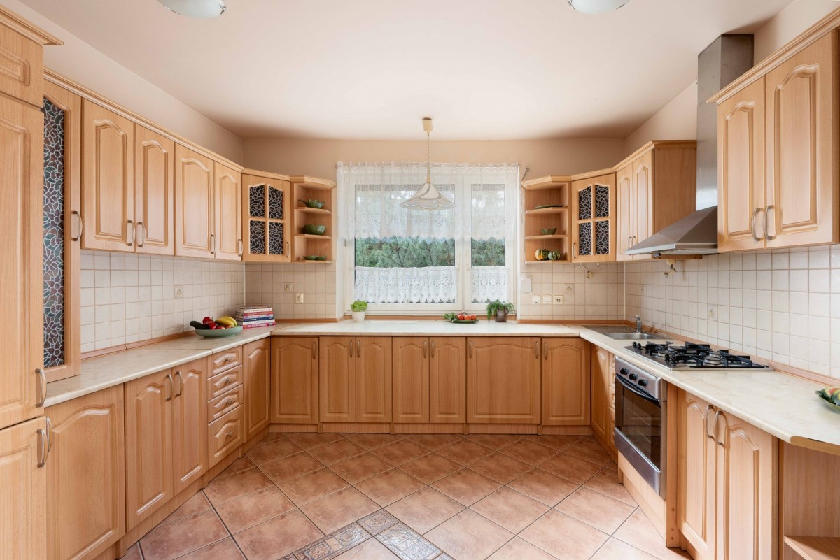 Już od bramy wita Cię alejka wśród bujnych drzew i krzewów. Idąc nią, docierasz do domu w którym za progiem wchodzisz do przestronnego wiatrołapu (10,7 m²), gdzie zostawiasz płaszcz i buty, mając do dyspozycji sporo miejsca na garderobę. Stąd przechodzisz do korytarza (13,8 m²), z którego "zaglądasz" do pokoju gościnnego (15,4 m²), aktualnie jadalni a następnie przenosisz się do salonu z kominkiem (26,9 m²)-przyjaznym miejscem na rodzinne spotkania. Wyjście na taras i duży ogród od strony zachodniej pozwala cieszyć się przyrodą i ciszą - to idealne miejsce na poranną kawę lub wieczorny relaks. Na parterze znajduje się jeszcze widna łazienka (4 m2) z prysznicem i odrębna duża i jasna kuchnia (15,2 m²) z której bezpośrednio masz dostęp do spiżarni, piwnicy i garażu. Metraż ok 25m2 pozwala na zorganizowanie w tym miejscu pomieszczenia gospodarczego, np. pralni i suszarni, co gwarantuje wygodę na co dzień. W tej części-w podziemiu, znajduje się również kotłownia.