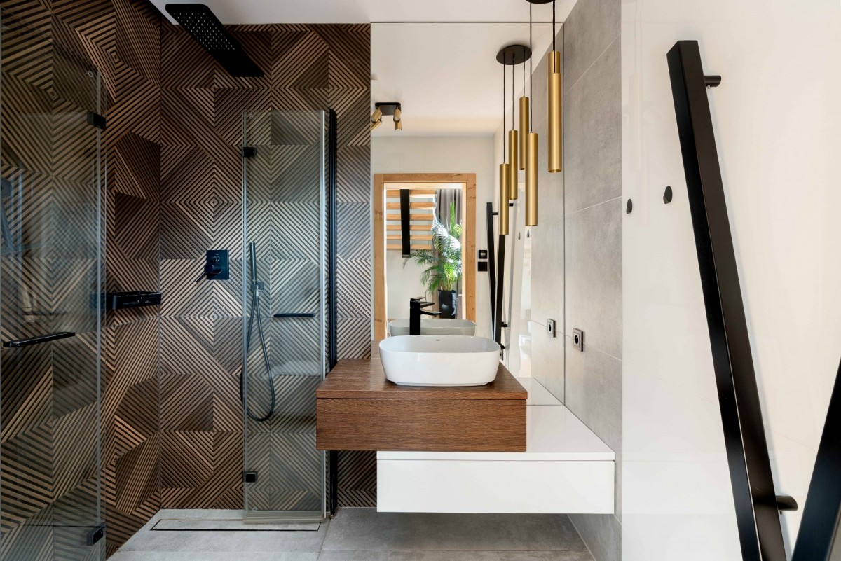 • PARTER: salon (ok. 27 m2, wysokość 9 m2) z antresolą i wyjściem na bardzo duży taras (ok. 60 m2); kuchnia z wyspą i spiżarnią (blaty granitowe); pokój gabinetowy (ok. 14 m2); łazienka z kabiną prysznicową i WC; pralnia z wyjściem na ogród; pomieszczenie techniczno-gospodarcze; korytarz z pojemnymi szafami w zabudowie;
