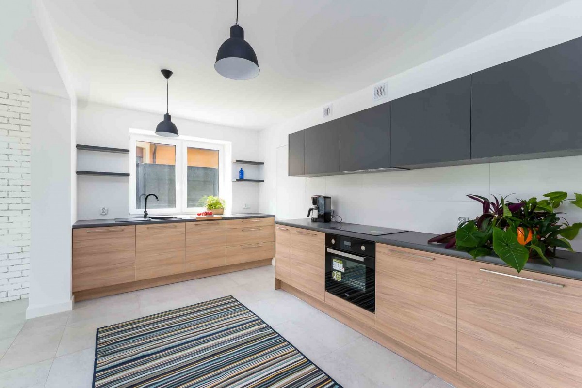 Wyposażenie AGD: lodówka, zmywarka, piekarnik, płyta indukcyjna, okap, pralka.