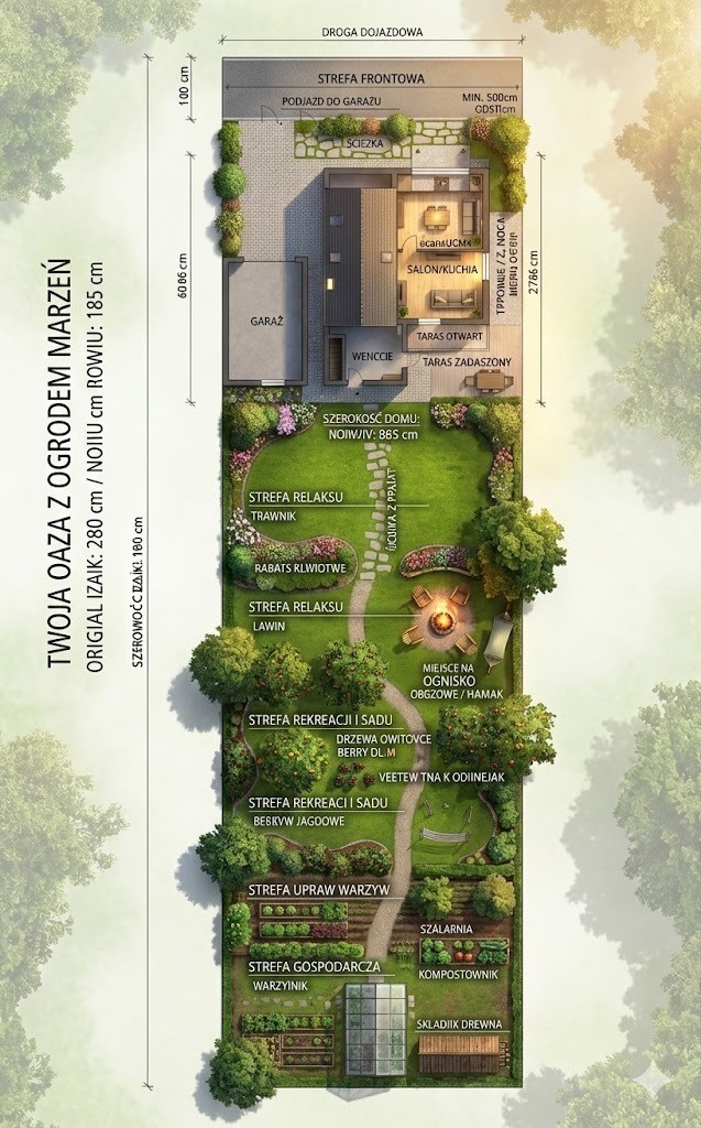 Prywatność: Długi kształt działki pozwala na oddzielenie strefy frontowej od głębokiego, zielonego ogrodu na terenach rolnych.