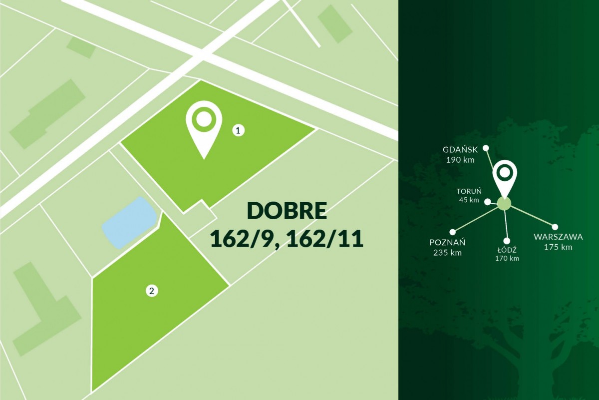 Działki znajdują się w cichej części miejscowości Dobre, w otoczeniu terenów rolnych i zieleni. Doskonałe miejsce dla osób szukających kontaktu z naturą lub gruntu pod przyszłe inwestycje.