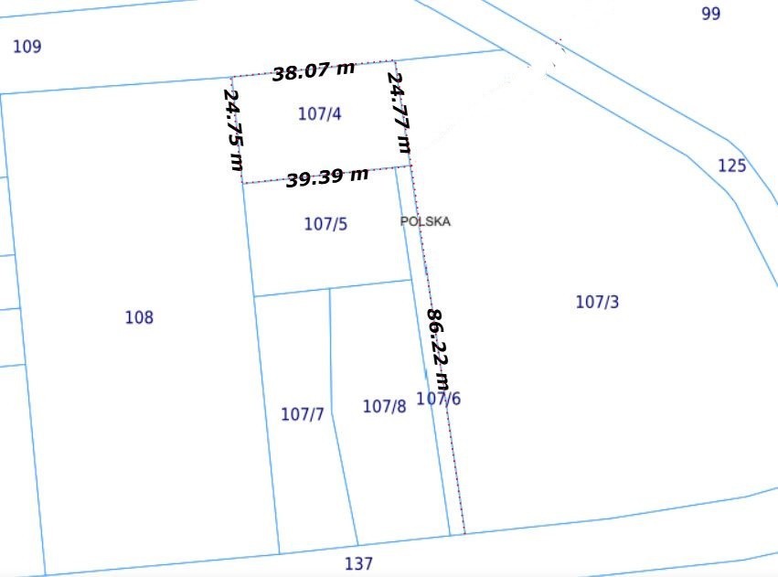 Działka płaska, równa o regularnym kształcie prostokąta o wymiarach około 24,7 x 38,0 metrów.