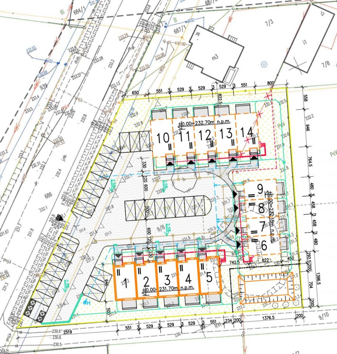 Na powierzchni 3147m2 zostało zaplanowane 14 segmentów z dwoma miejscami parkingowymi dla każdego segmentu. Przez teren działki przebiega sieć wodociągowa, sieć telekomunikacyjna oraz sieć niskiego napięcia. Przy granicy z działką doprowadzono przyłącze kanalizacji (planowane przyłącze do sieci gminnej). Dla inwestycji planuje się również wykorzystanie naziemnego otwartego szczelnego zbiornika do zagospodarowania wody opadowej.