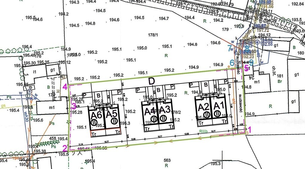 - Przeznaczenie: Budownictwo jednorodzinne. Procedowana jest aktualnie WZ-ka na realizację 6 domów jednorodzinnych w zabudowie bliźniaczej z garażami jednostanowiskowymi.