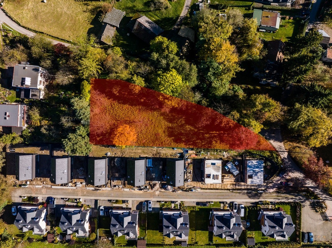 Płaska parcela w kształcie trapezu, niezagospodarowana, ogrodzona.