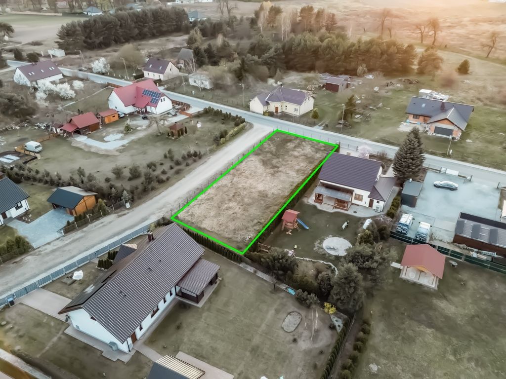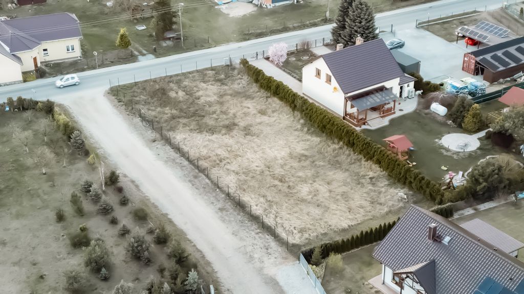 Działka narożna położona przy drodze asfaltowej oraz utwardzonej drodze dojazdowej do sąsiadujących działek, w okolicy jedynie niska zabudowa.