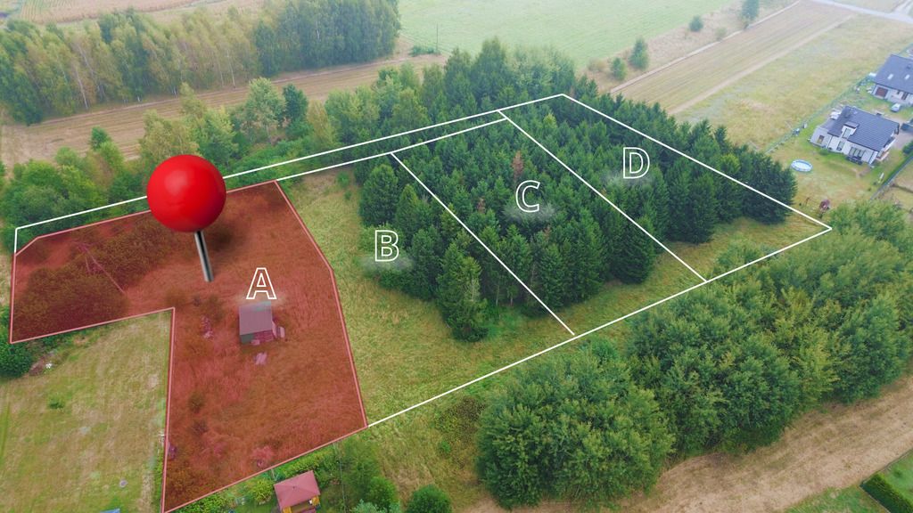 Działka o powierzchni 0.1737 hektara, aktualnie działka rolna porośnięta drzewami (użytek R i Lzr).