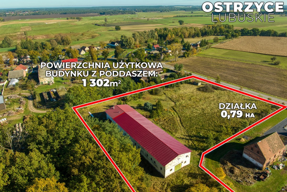 Na sprzedaż prezentujemy nieruchomość gruntową o pow. 99.100 m² (9.91 ha), zabudowaną budynkiem parterowym magazynowo-produkcyjnym o pow. użytkowej 737 m², w którym znajduje się również mieszkanie o pow. 120 m². Oferta zlokalizowana jest w miejscowości Ostrzyce gm. Trzebiechów, w woj.lubuskim.