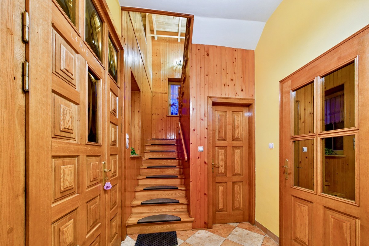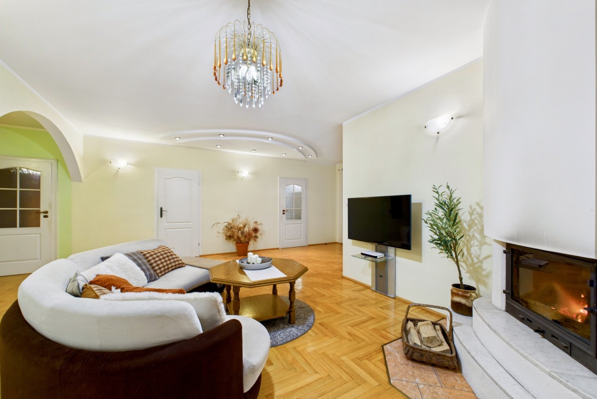 - wysokiej jakości wykończenie: dębowe parkiety, drewniane detale, kominek,