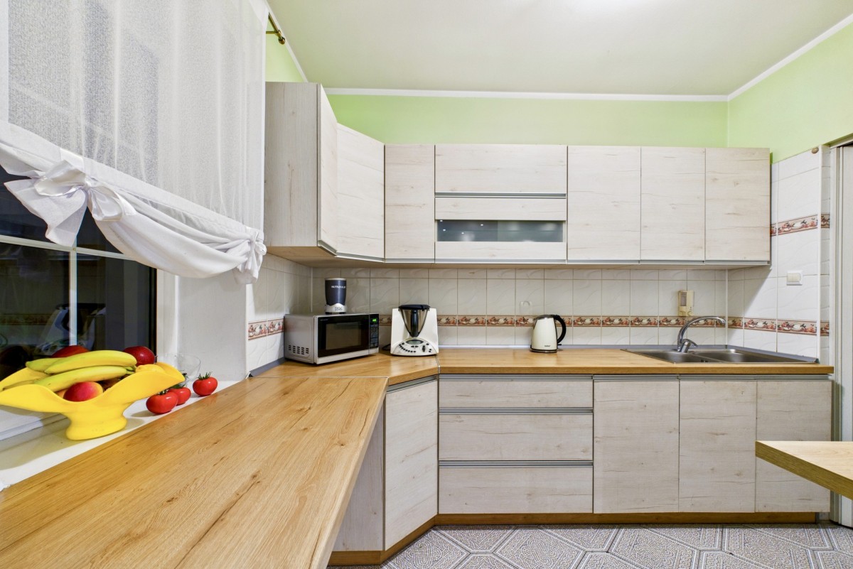 - kuchnia jest w pełni wyposażona w sprzęty AGD: płytę indukcyjną, piekarnik, mikrofalówkę, czajnik i okap,