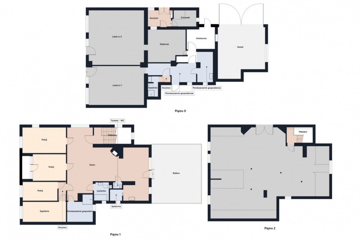 2) Na piętrze mieści się przestronna część mieszkalna o łącznej powierzchni 140 m²: