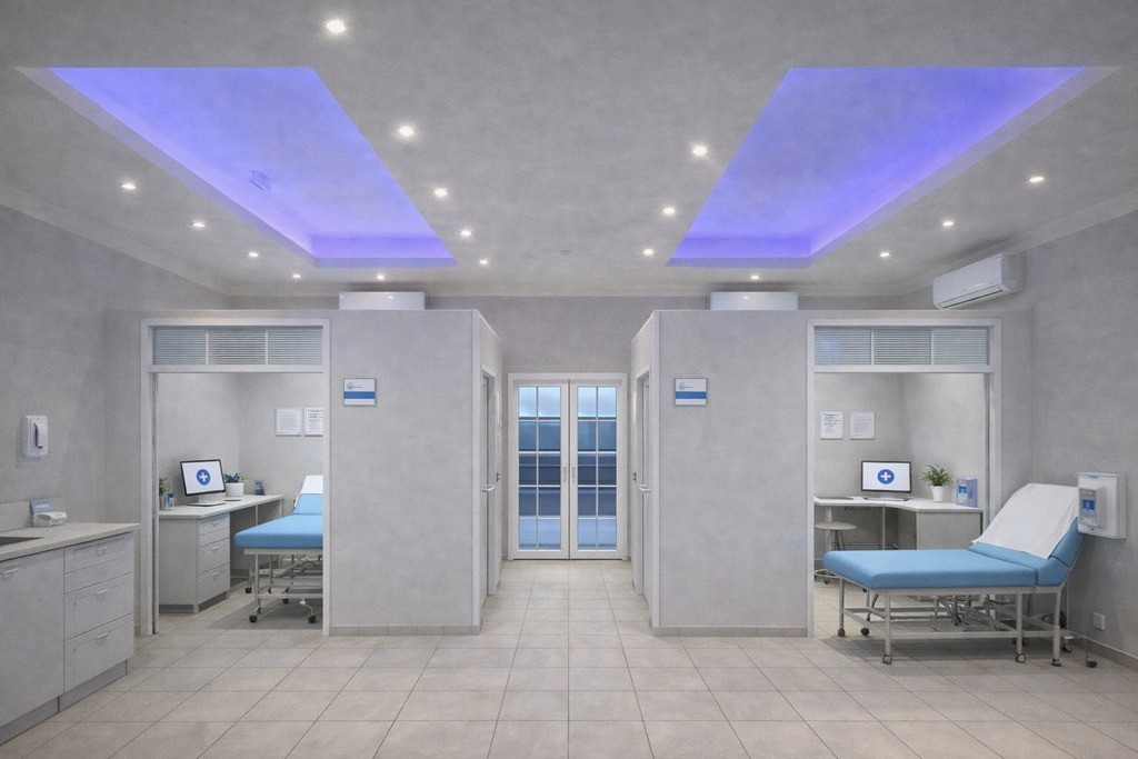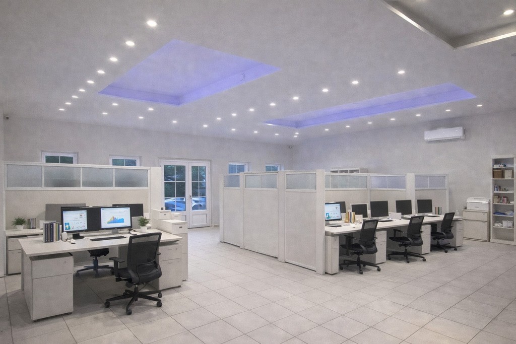 Istnieje jednak możliwość postawienia ścianek działowych. Dzięki temu z łatwością wyodrębnimy osobne pomieszczenia np. do pracy biurowej lub np. na gabinety medyczne czy salki szkoleniowe/lekcyjne.