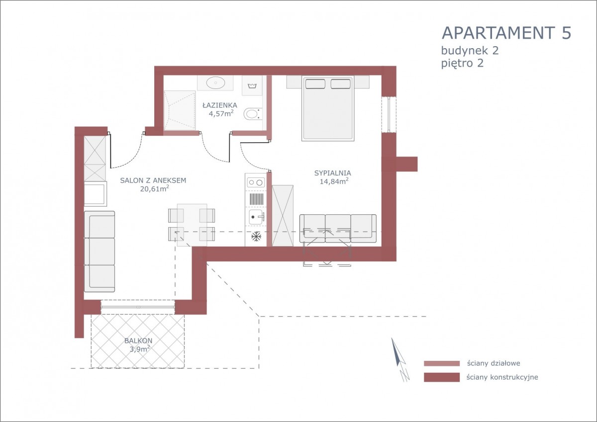 Układ apartamentu (pow. całkowita ok. 40 m² + 1 balkon):