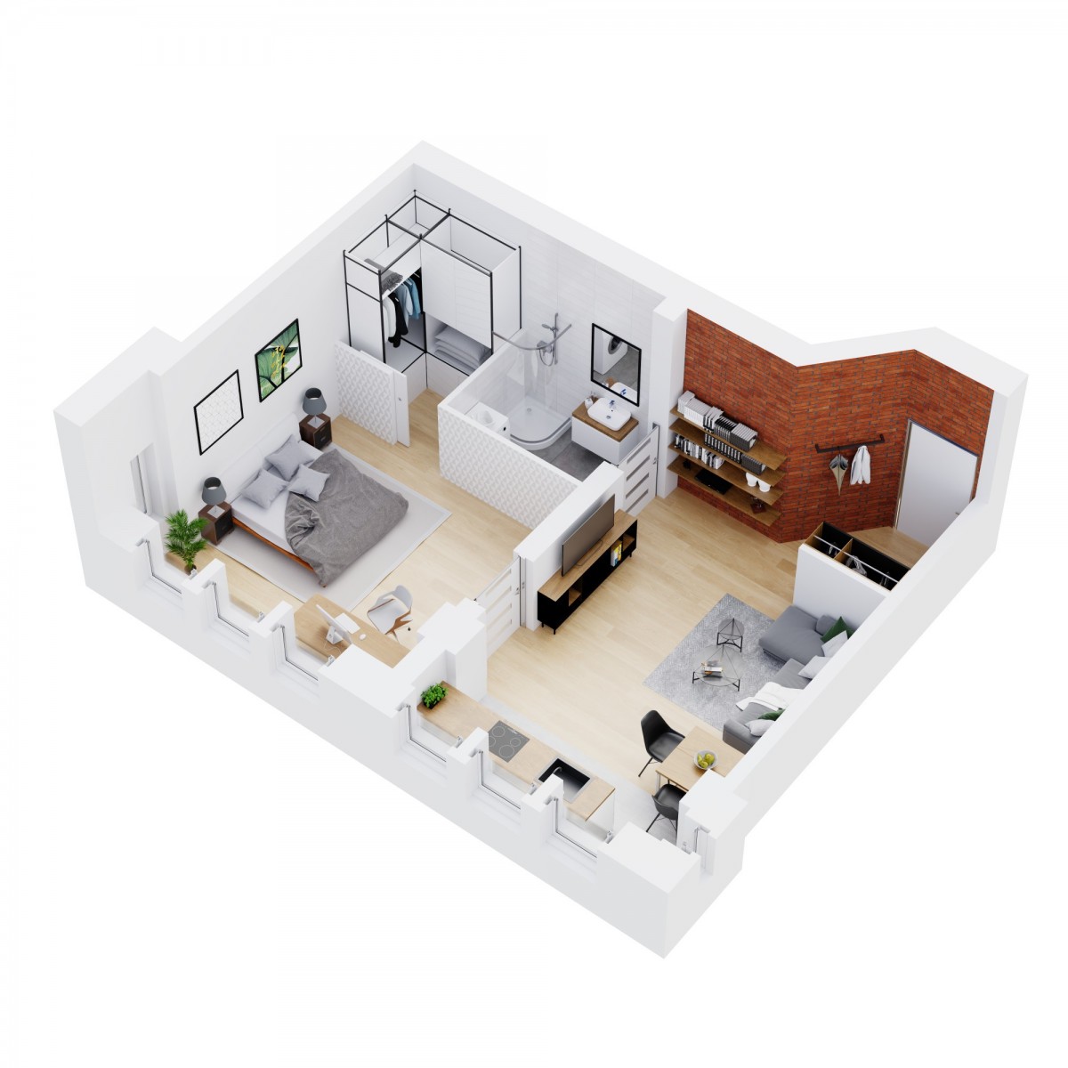 Mieszkanie z funkcjonalnym układem - pokój z aneksem kuchennym, łazienka, przedpokój i sypialnia z garderobą.