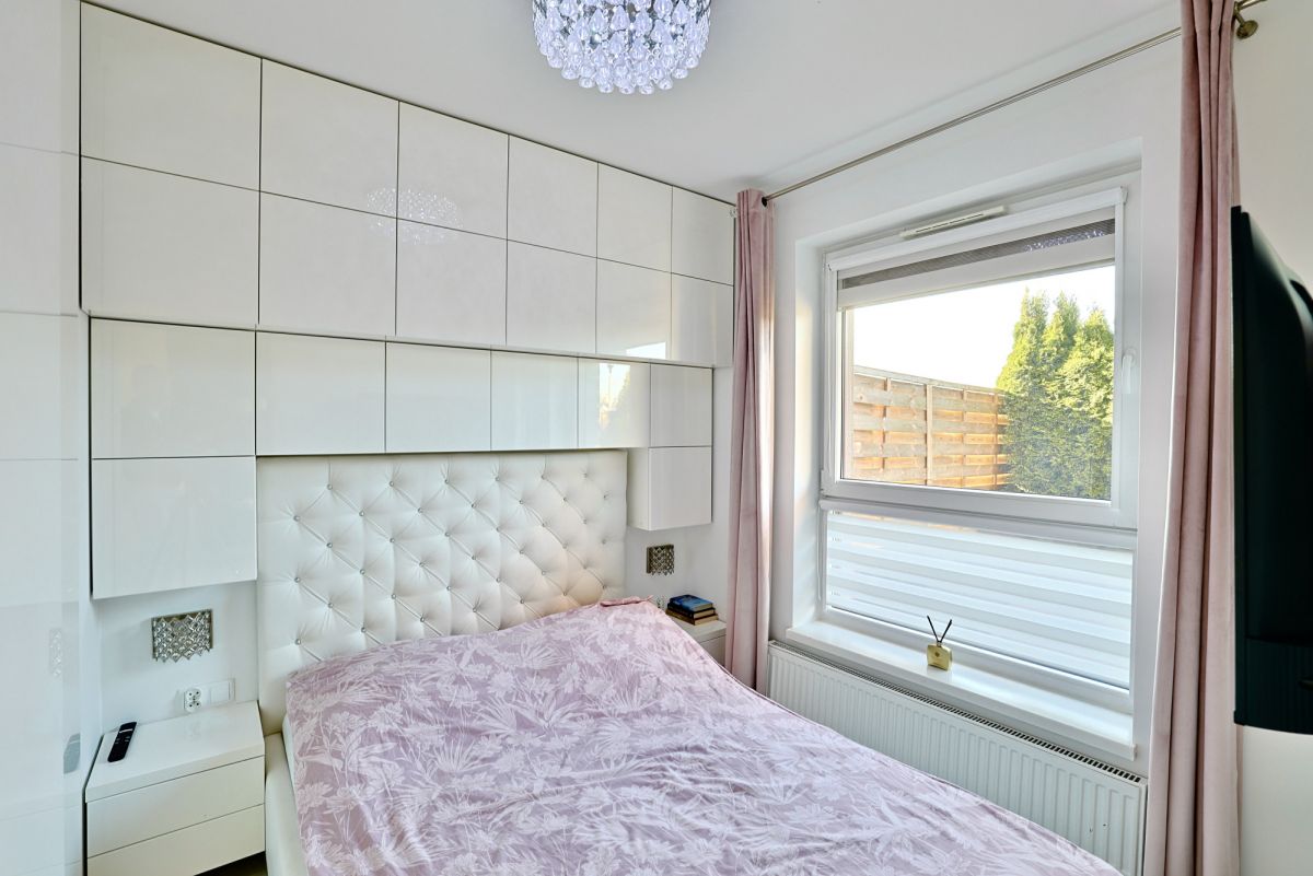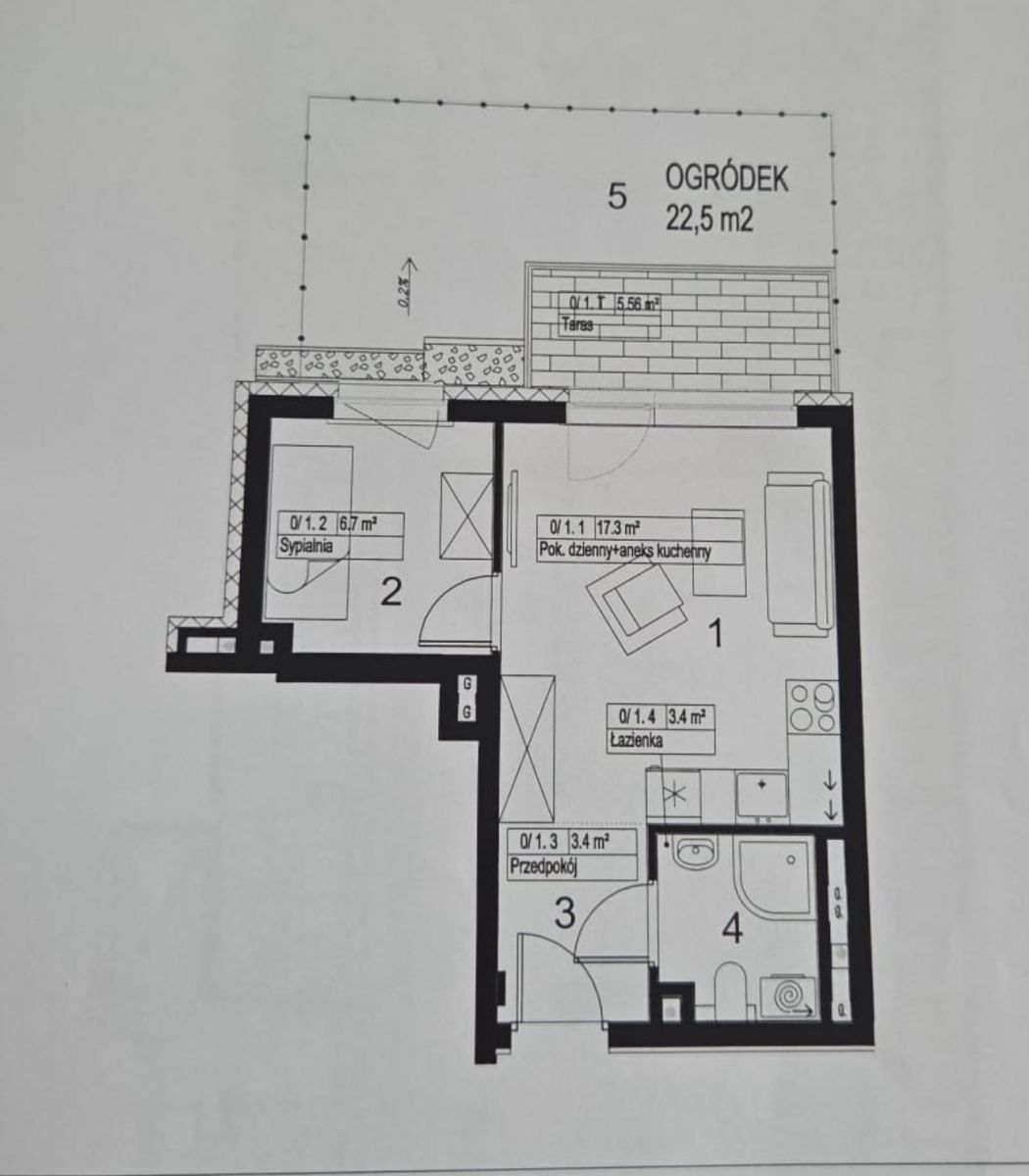 Przemyślany układ sprawia, że mieszkanie jest bardzo funkcjonalne mimo kompaktowej powierzchni. Strefa dzienna z aneksem kuchennym jest dobrze doświetlona i posiada wyjście do ogrodu, natomiast oddzielna sypialnia zapewnia prywatność i komfort wypoczynku.