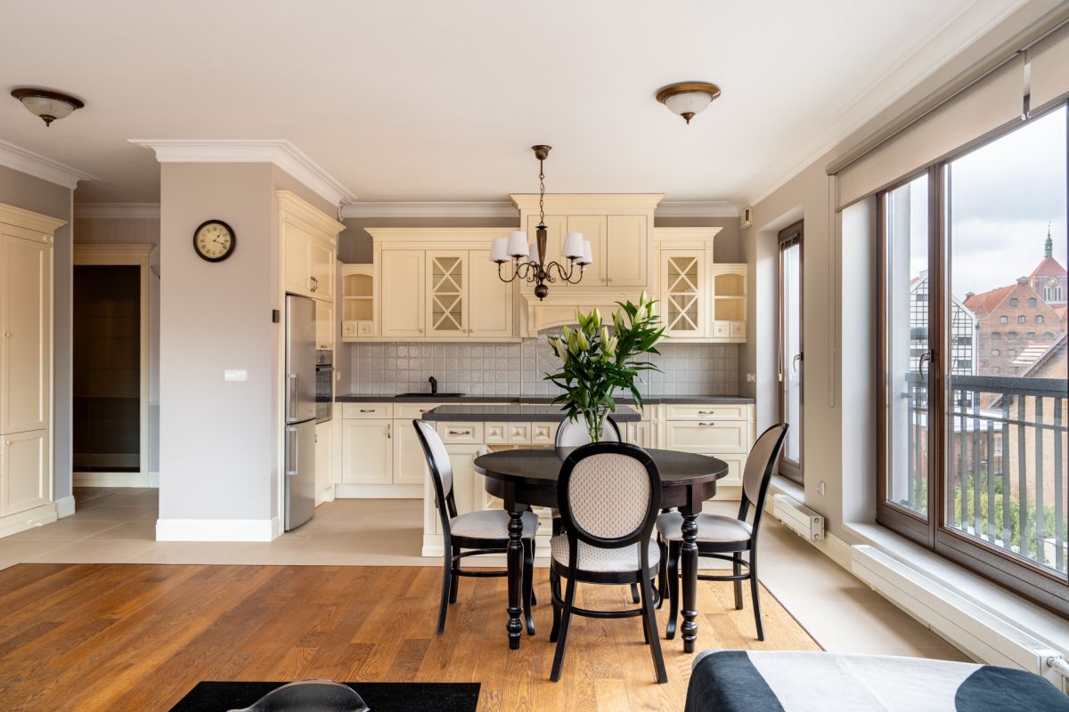 * Jadalnia z okrągłym drewnianym stołem i czterema stylowymi krzesłami, oświetlona klasycznym żyrandolem.