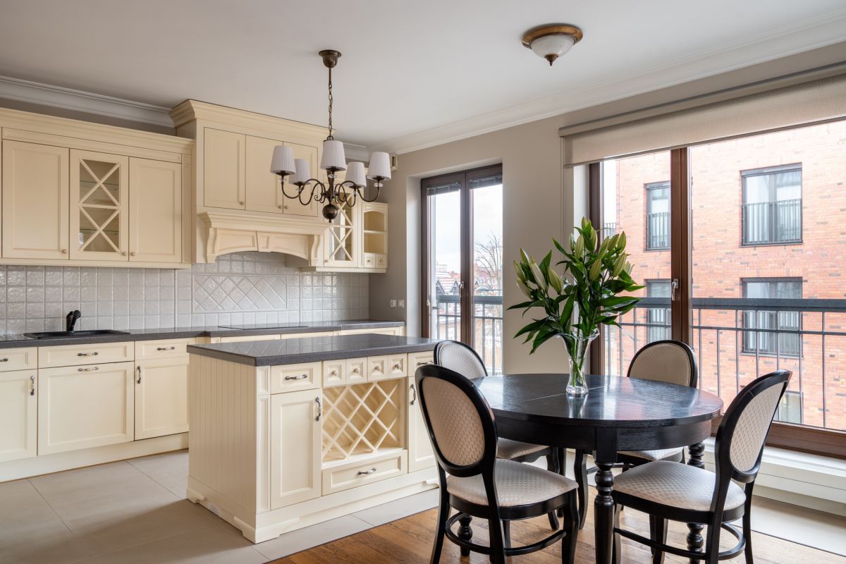 * Kuchnia z klasyczną, kremową zabudową, frezowanymi frontami i przeszklonymi witrynami. Wyspa z ciemnym kamiennym blatem oraz zintegrowanym regałem na wino. Pełne wyposażenie AGD w zabudowie: lodówko-zamrażarka, zmywarka, piekarnik, okap, płyta grzewcza.