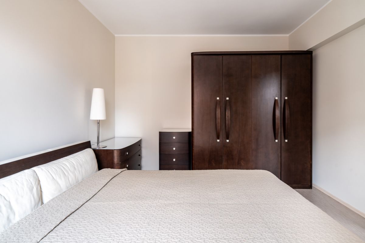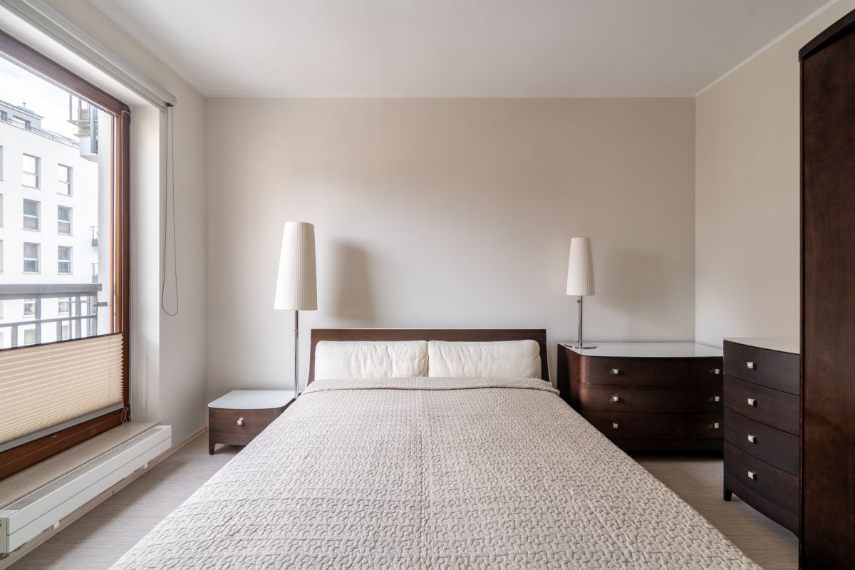 * Sypialnia (13,80 m²) z podwójnym łóżkiem małżeńskim z eleganckim drewnianym zagłówkiem, komodą oraz pojemną szafą.