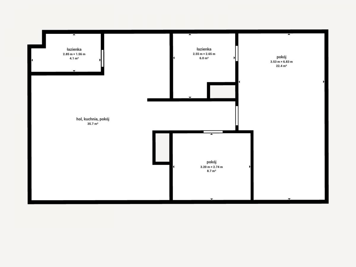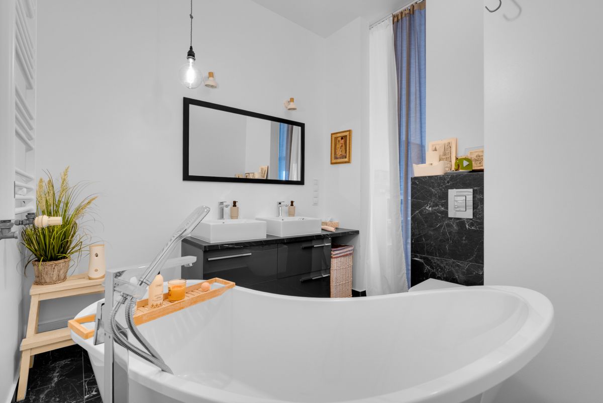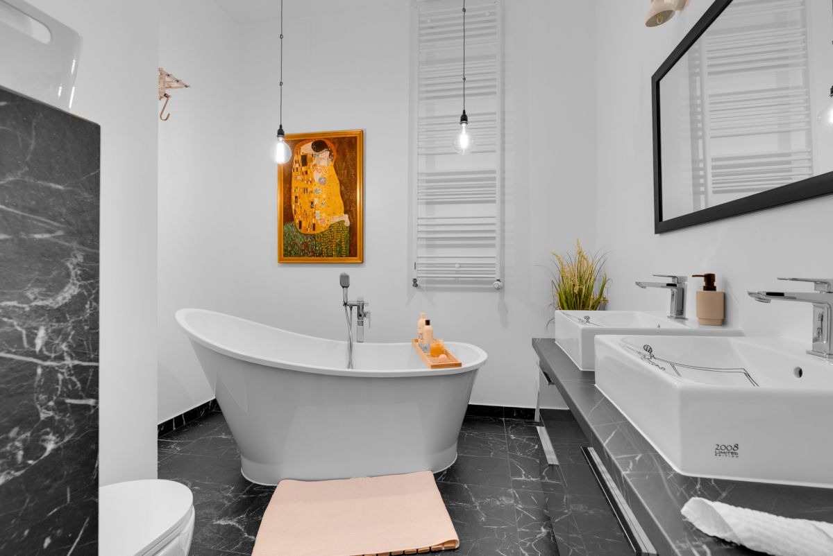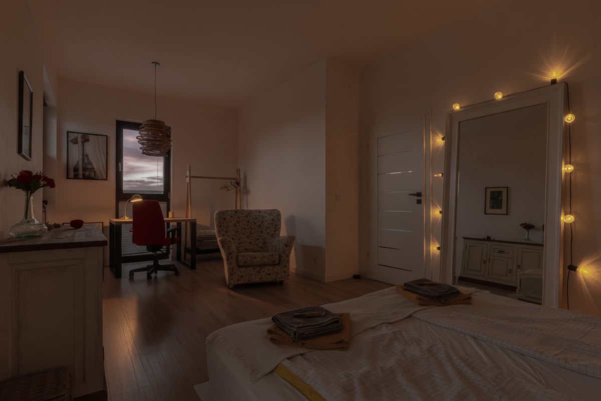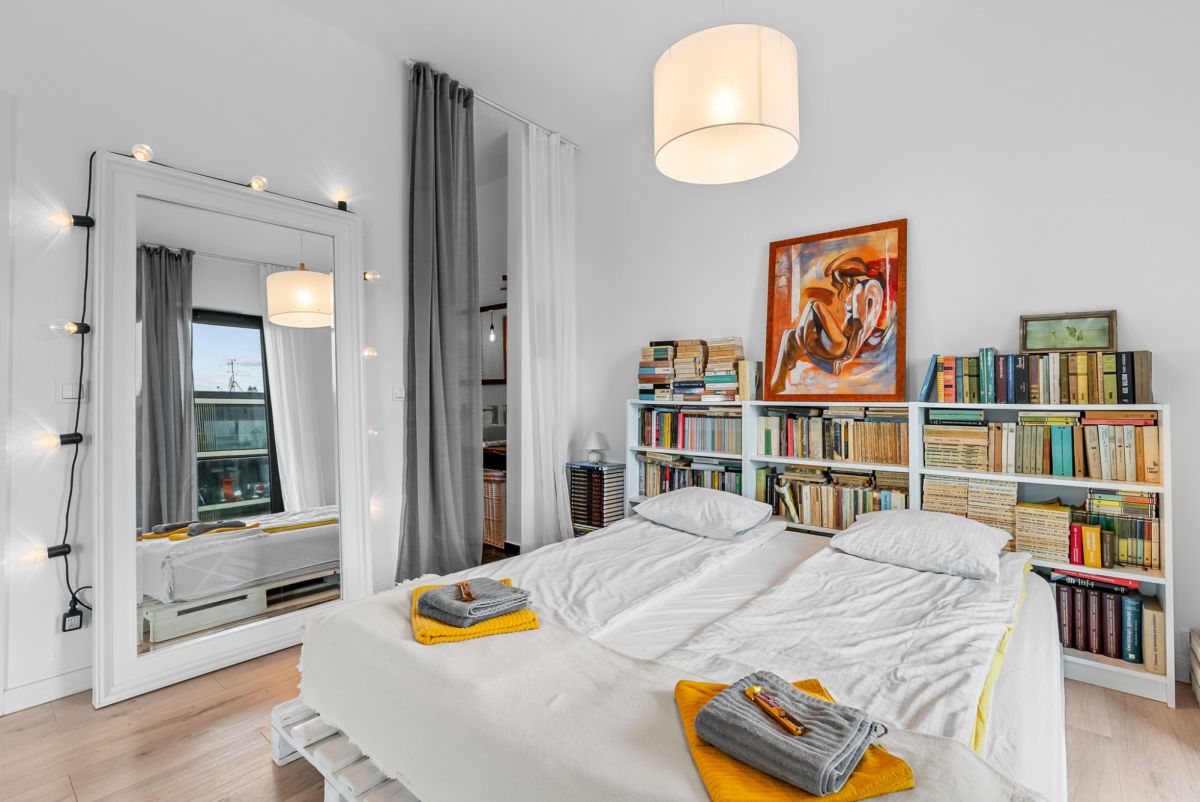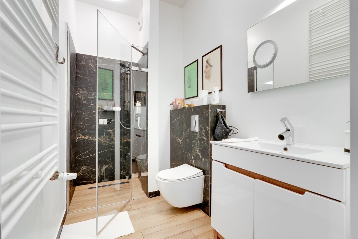 Wysokość pomieszczeń 2,8 m wzmacnia poczucie przestrzeni, a grzejniki ukryte w podłodze podkreślają nowoczesny charakter wnętrza.