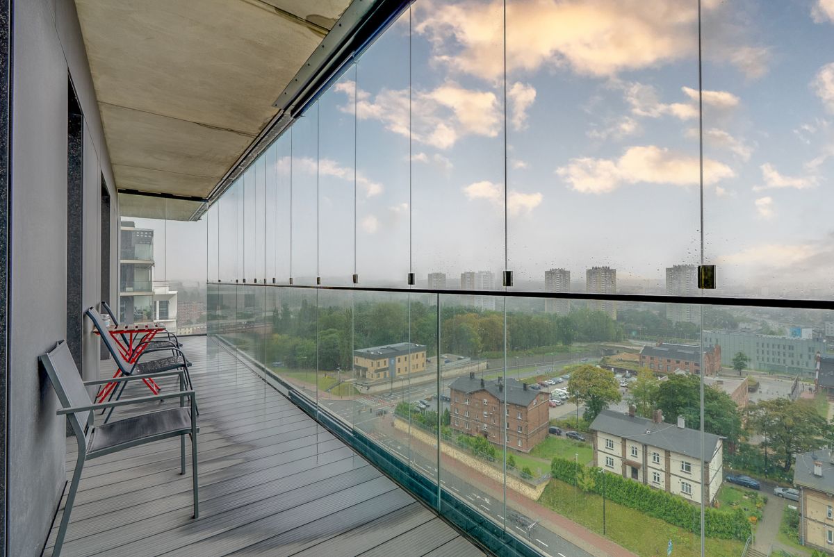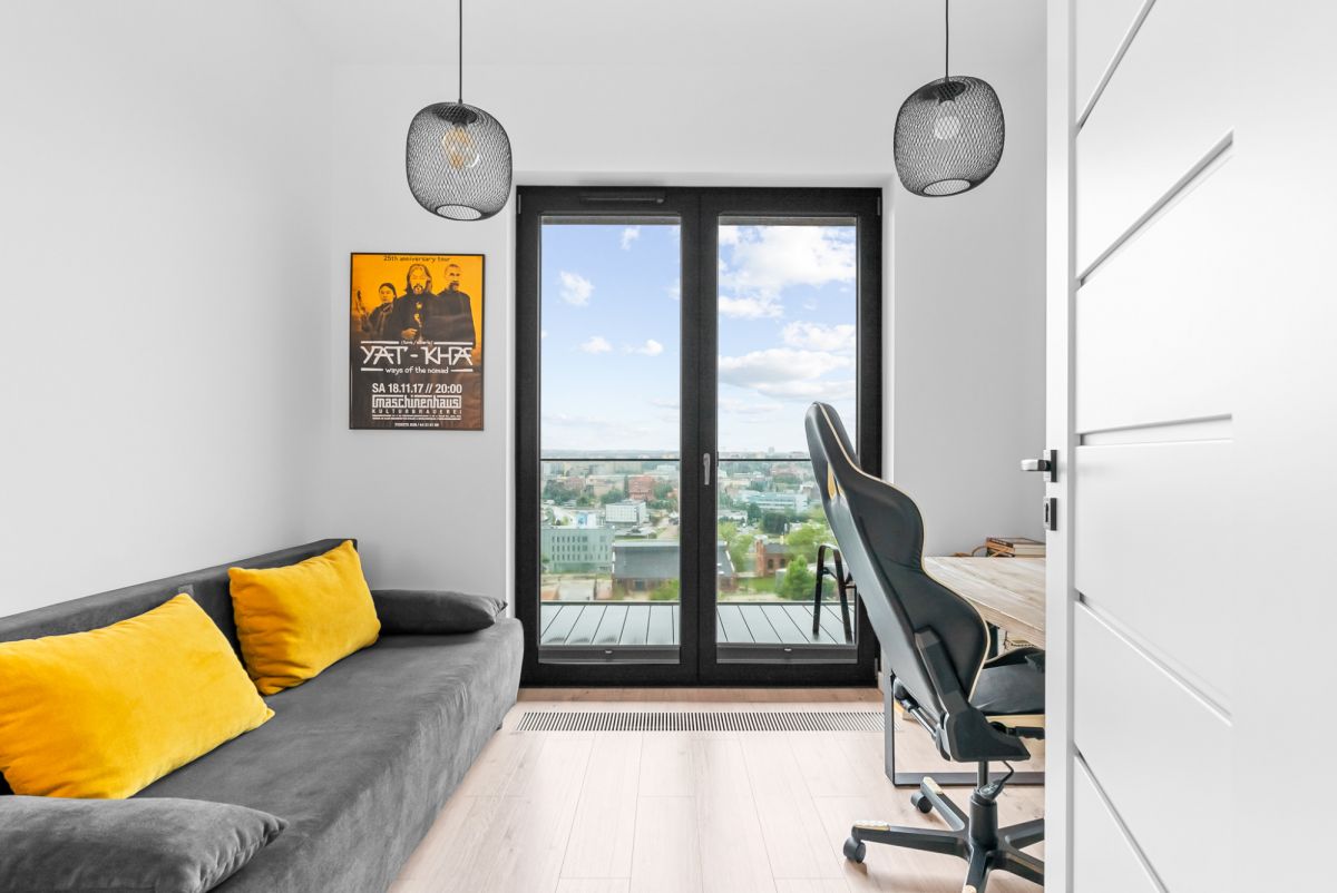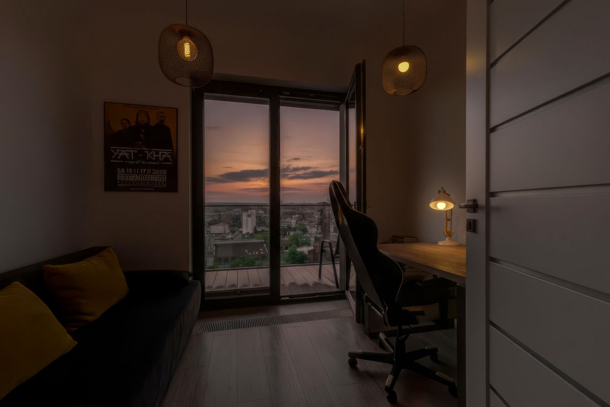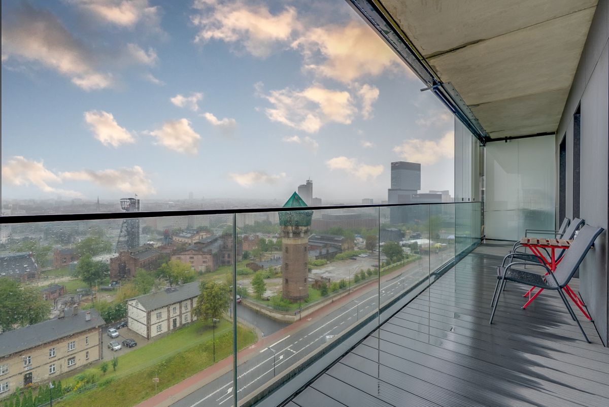 Z apartamentu rozpościera się otwarty widok na Strefę Kultury, centrum Katowic oraz panoramę miasta z górami w tle.