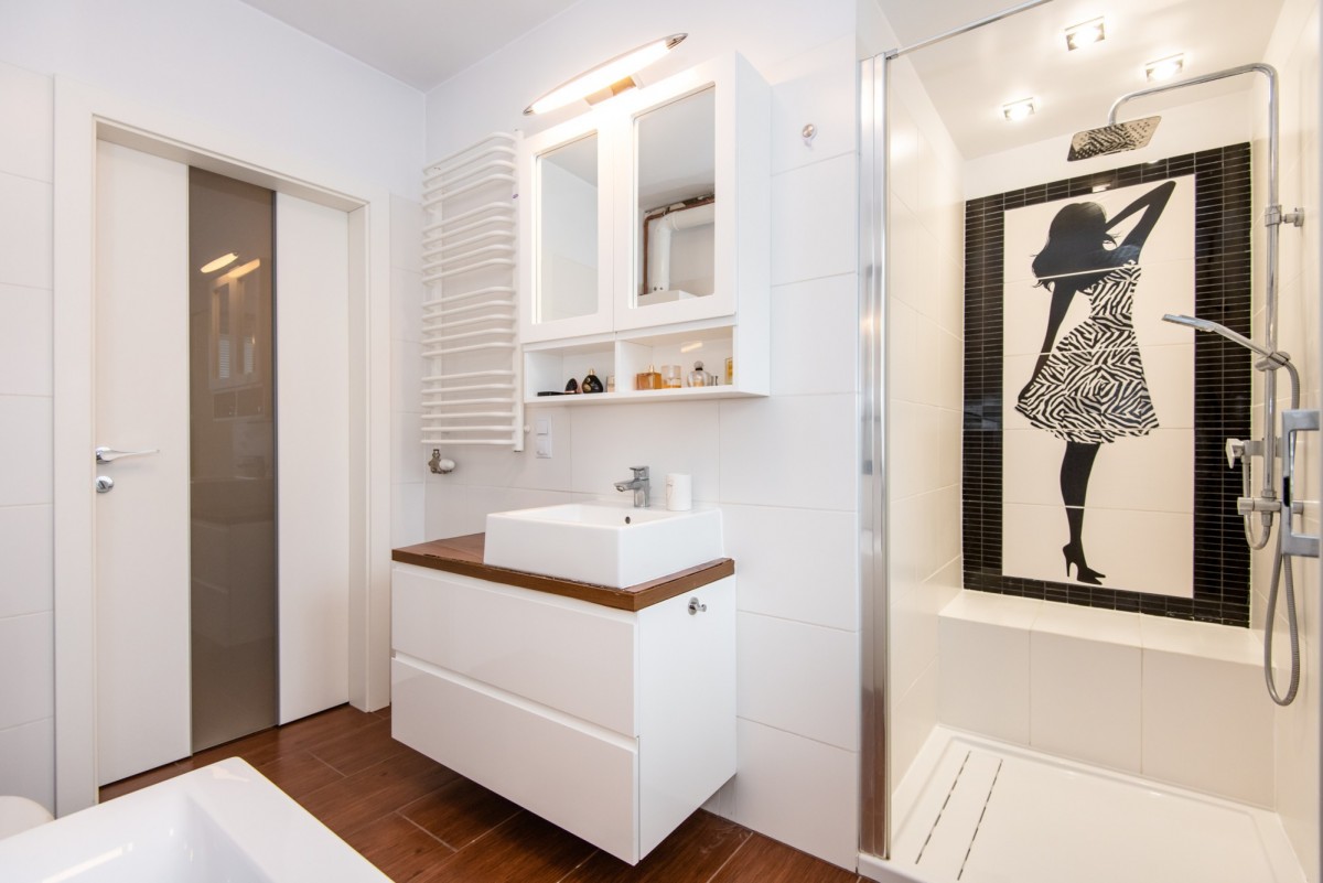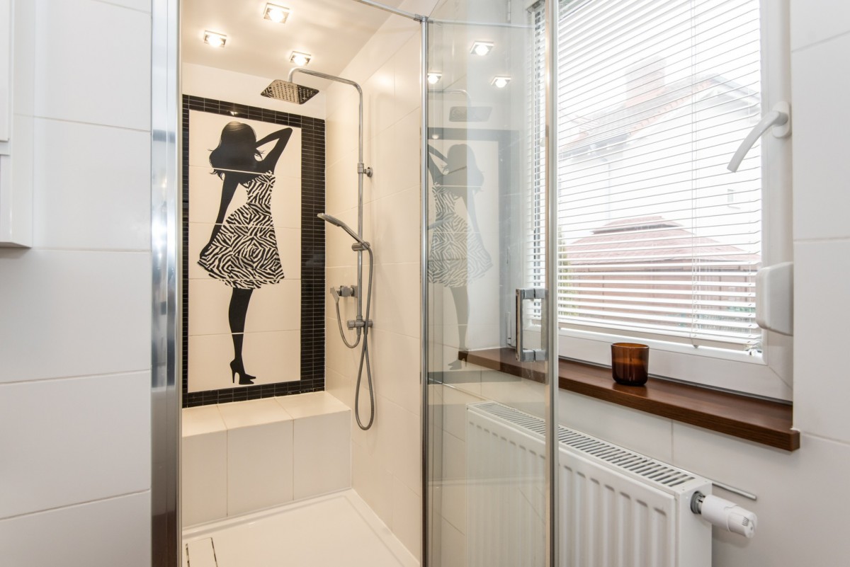 - Łazienki z oknem (ok. 5,5 m²) wyposażonej w wannę oraz kabinę prysznicową,