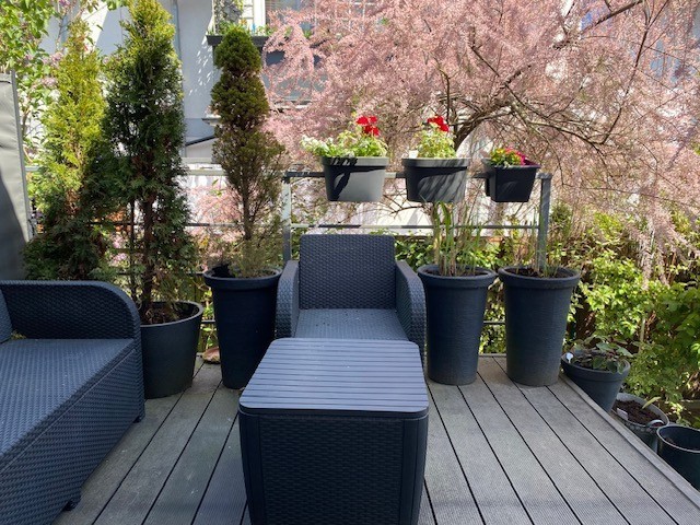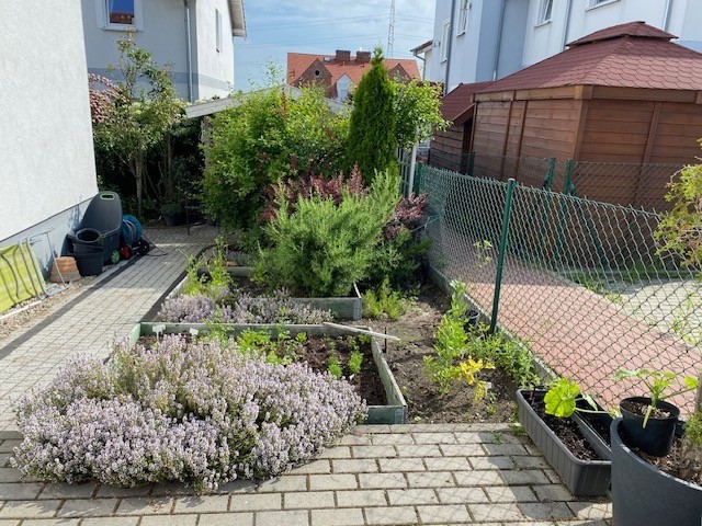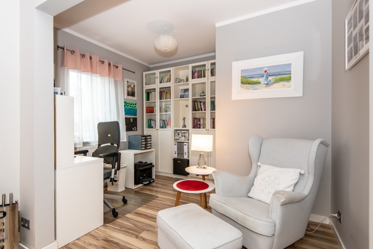Z salonu prowadzi wyjście na umeblowany taras o powierzchni ok. 9 m², a dalej do prywatnego ogrodu o powierzchni ok. 100 m², zagospodarowanego zielenią i kwiatami. Dodatkowo w ogrodzie znajduje się pomieszczenie gospodarcze, idealne na rowery, meble ogrodowe czy sprzęt rekreacyjny.