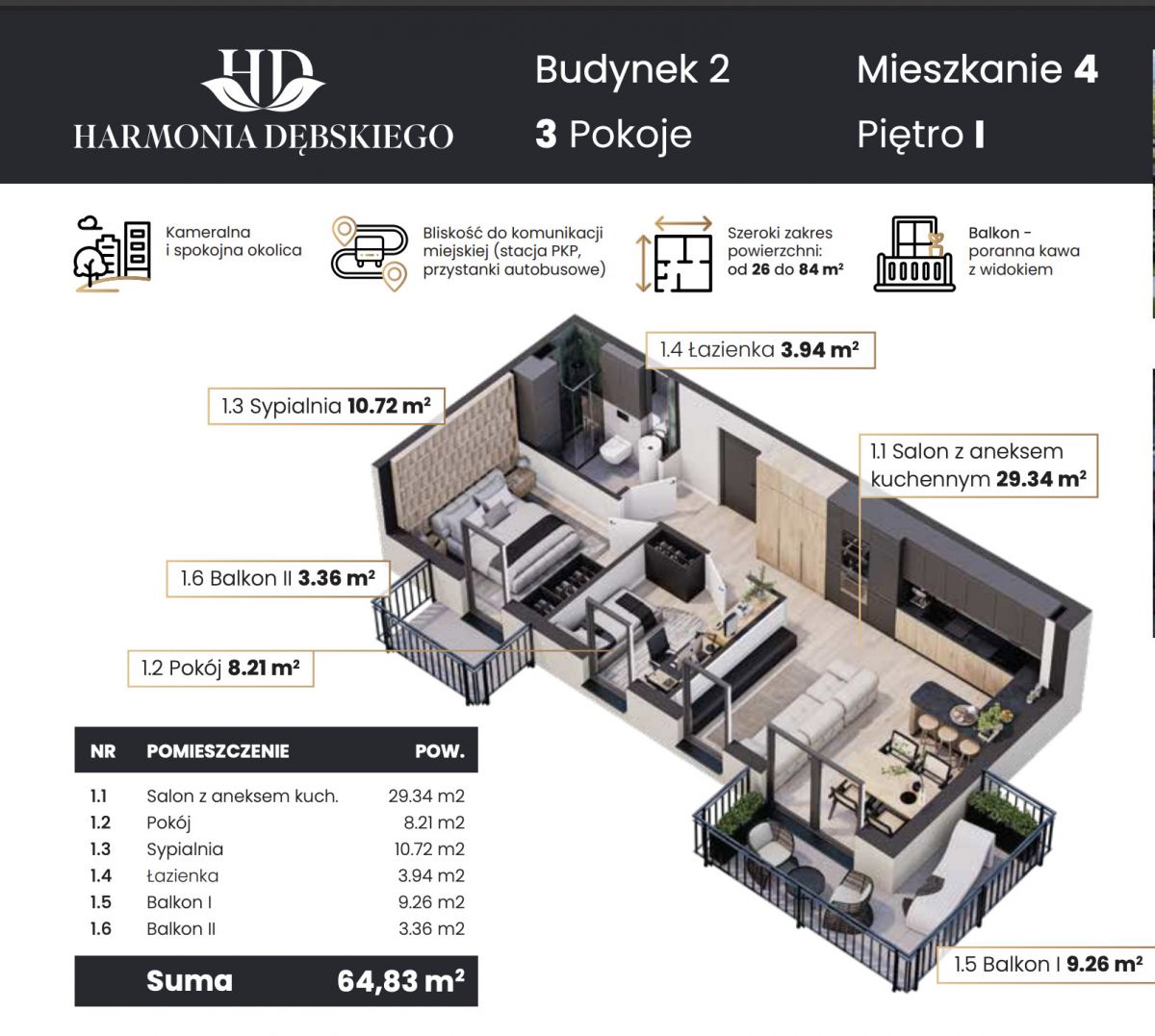 Nowoczesne, 3-pokojowe mieszkanie położone na1 piętrze w inwestycji Harmonia Dębskiego. Doskonały układ pomieszczeń. 2 balkony to dodatkowa przestrzeń do wypoczynku. Idealne dla rodzin lub par szukających komfortu w spokojnej, zielonej okolicy z dobrym dojazdem do centrum.