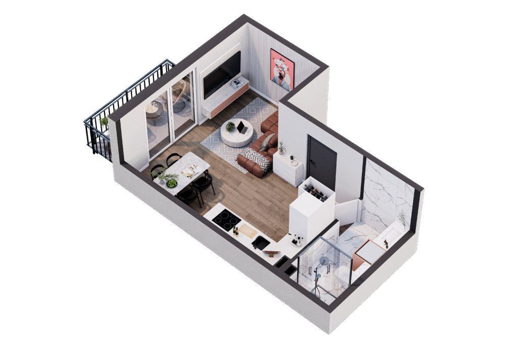 Jasne mieszkanie pow. 26.61 m² na 1 piętrze z balkonem w nowoczesnym budynku wielorodzinnym.