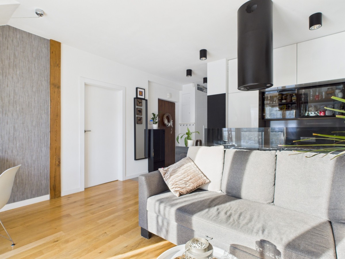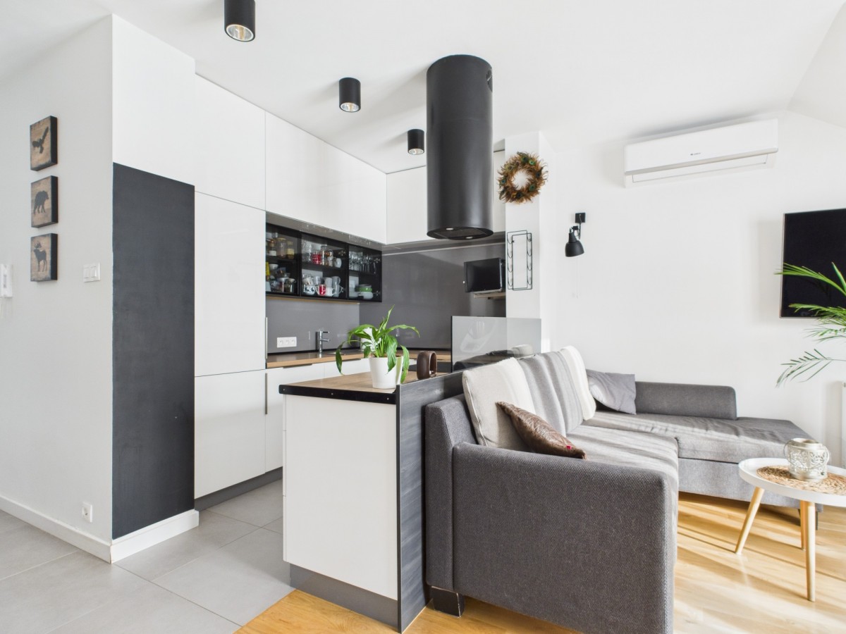 Salon z aneksem kuchennym i wyjściem na balkon,