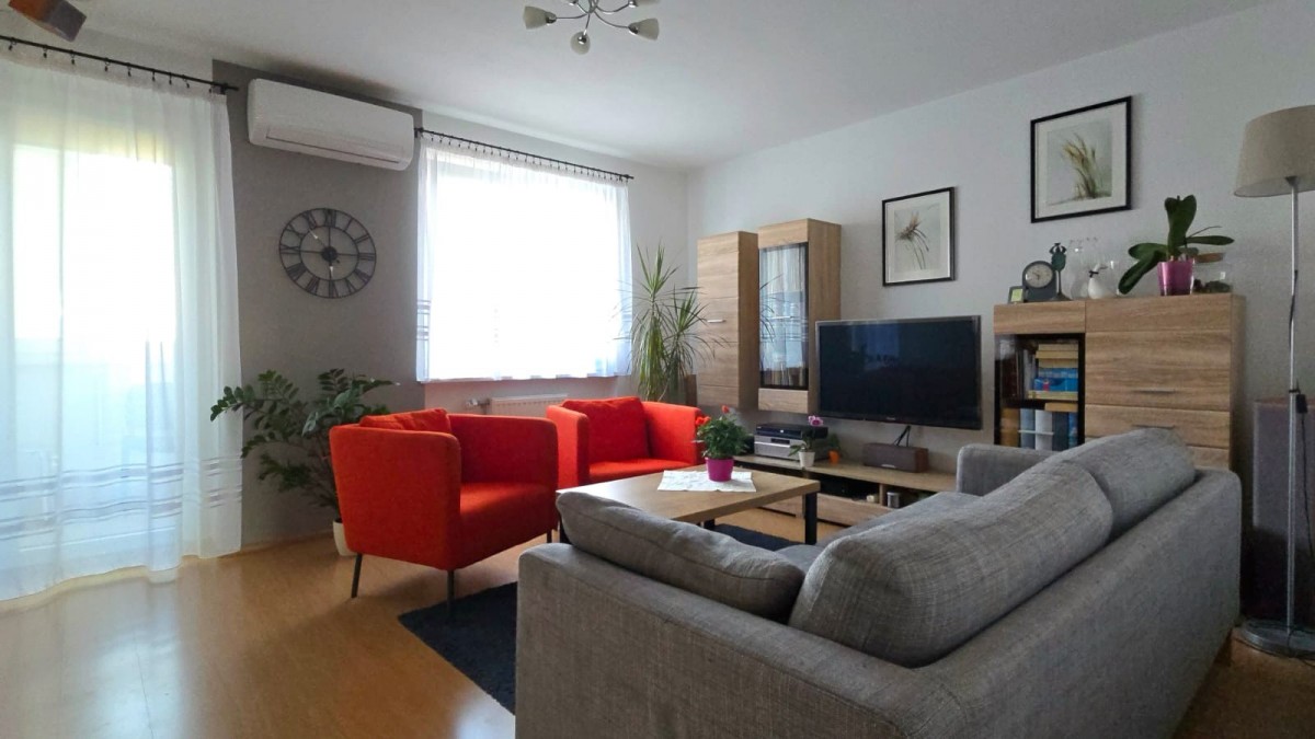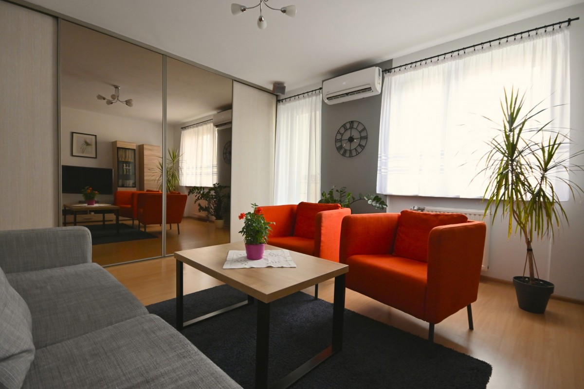 - Ustawny salon z wygodną kanapą, szafką RTV i biblioteczką, telewizorem, ławą, zabudowaną dużą szafą wnękową oraz wyjściem na balkon. Wyposażony w klimatyzację(chłodzi całe mieszkanie).