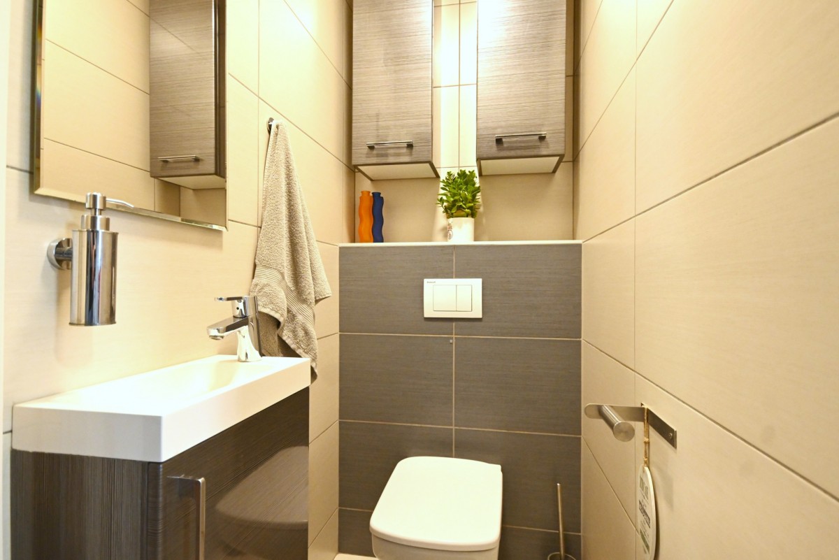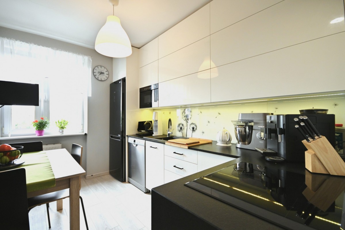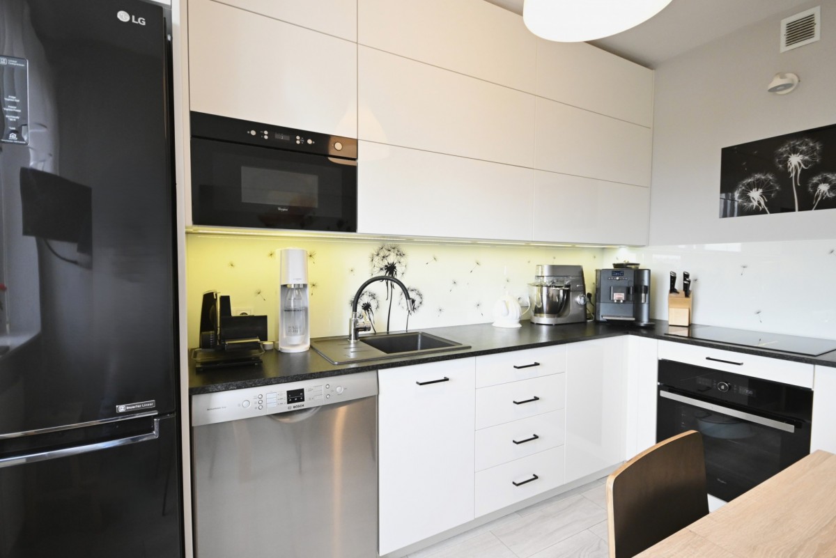 - W pełni wyposażona, jasna i praktyczna kuchnia w zabudowie na wymiar m. in. z kamiennym blatem, wysokiej klasy sprzętem AGD: lodówka z zamrażalką, zmywarka, piekarnik, płyta indukcyjna.