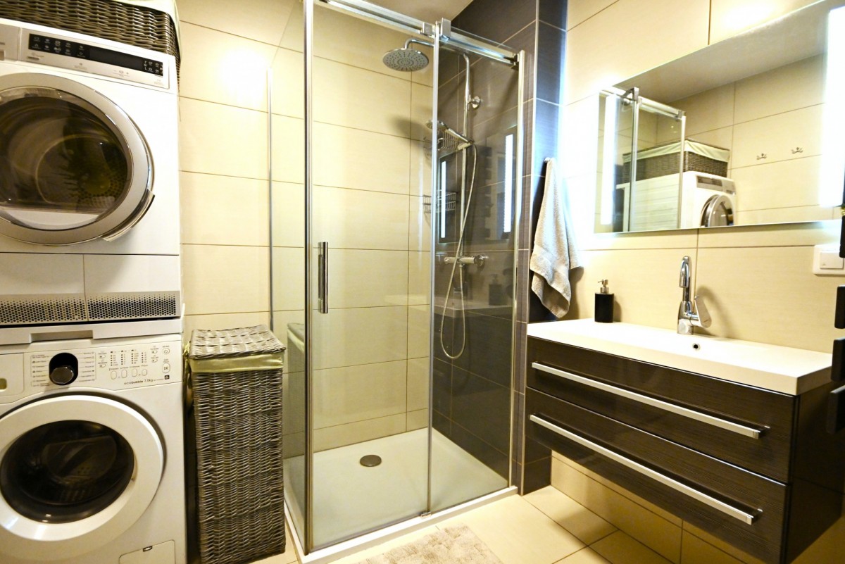 - Łazienka z przestronną kabiną prysznicową, szafka z umywalką, szafkami do przechowywania oraz pralką i suszarką.