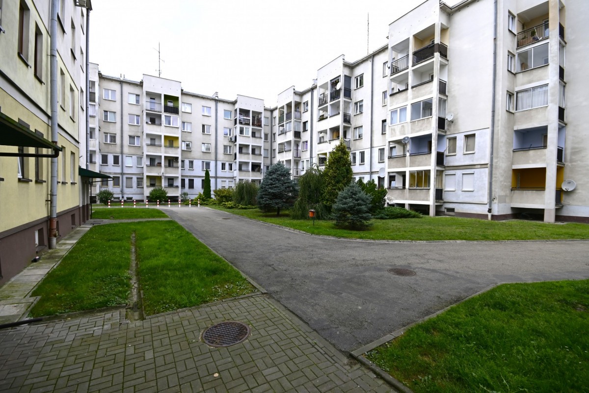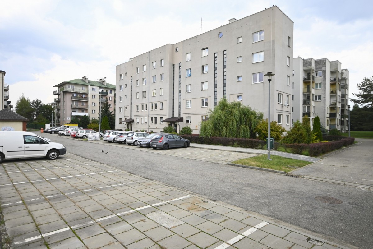 Z przestronnym parkingiem tylko dla mieszkańców bloku, ze szlabanem na pilota, komunikacją, zagospodarowanym terenem zielonym między blokami na wydzielonym terenie.