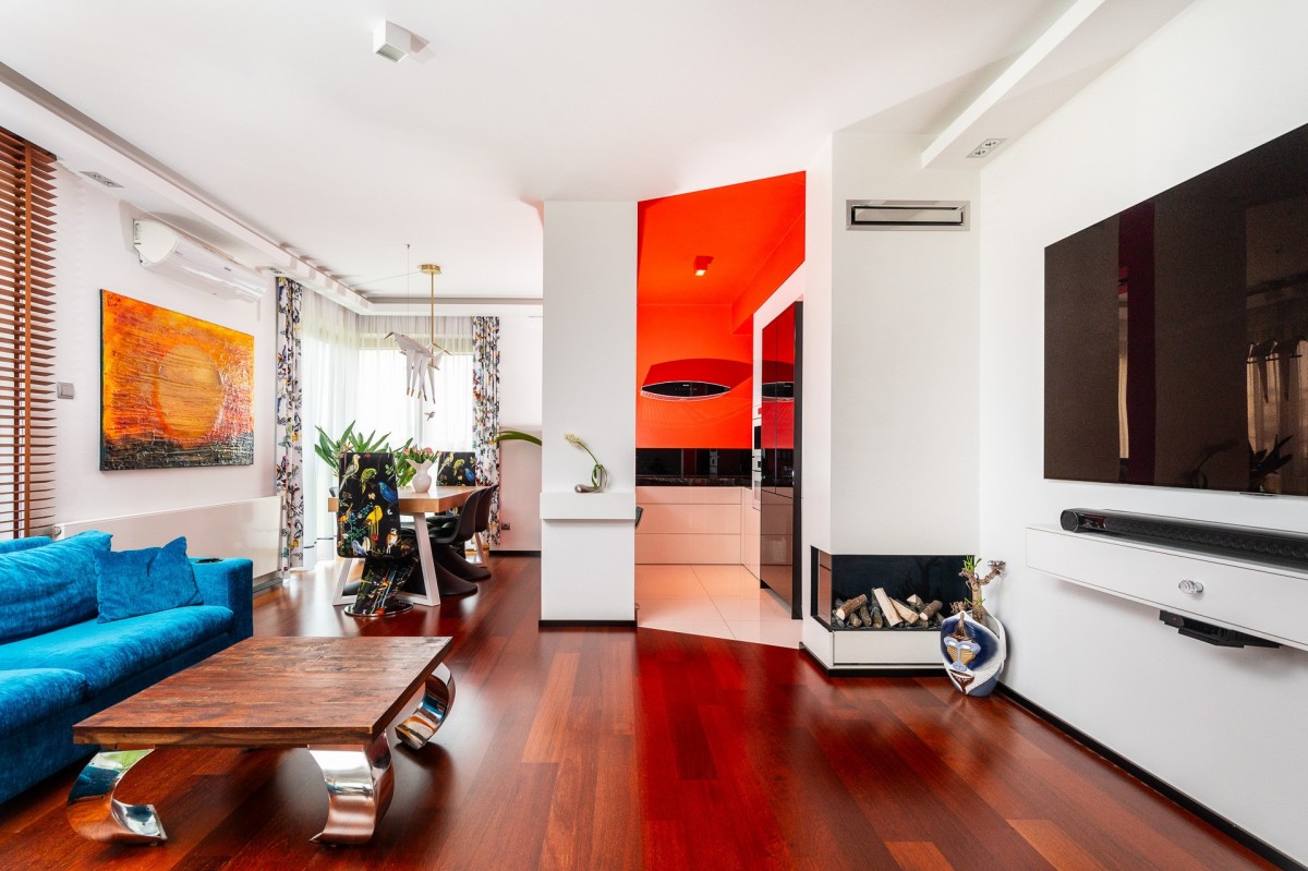 - kominek podświetlany w salonie