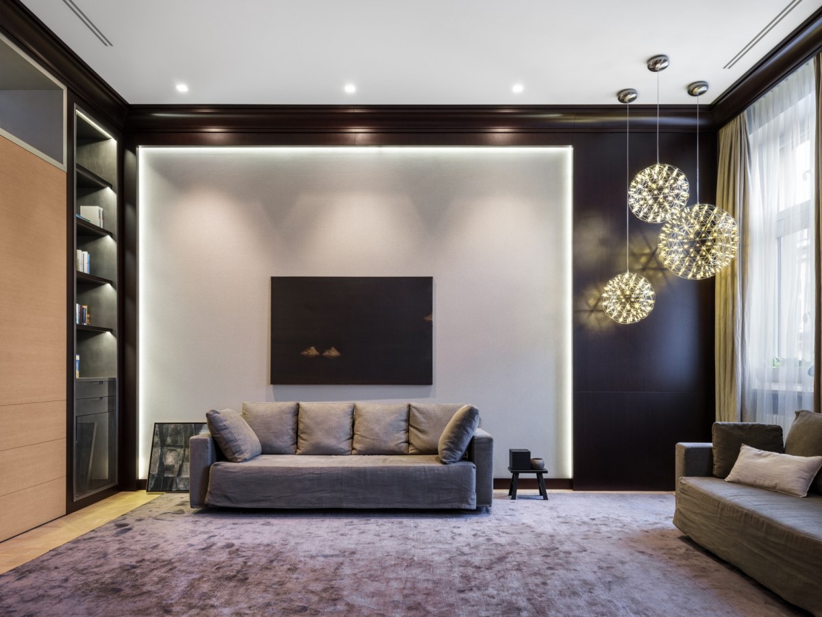 • reprezentacyjny salon z dużymi oknami i widokiem na Planty