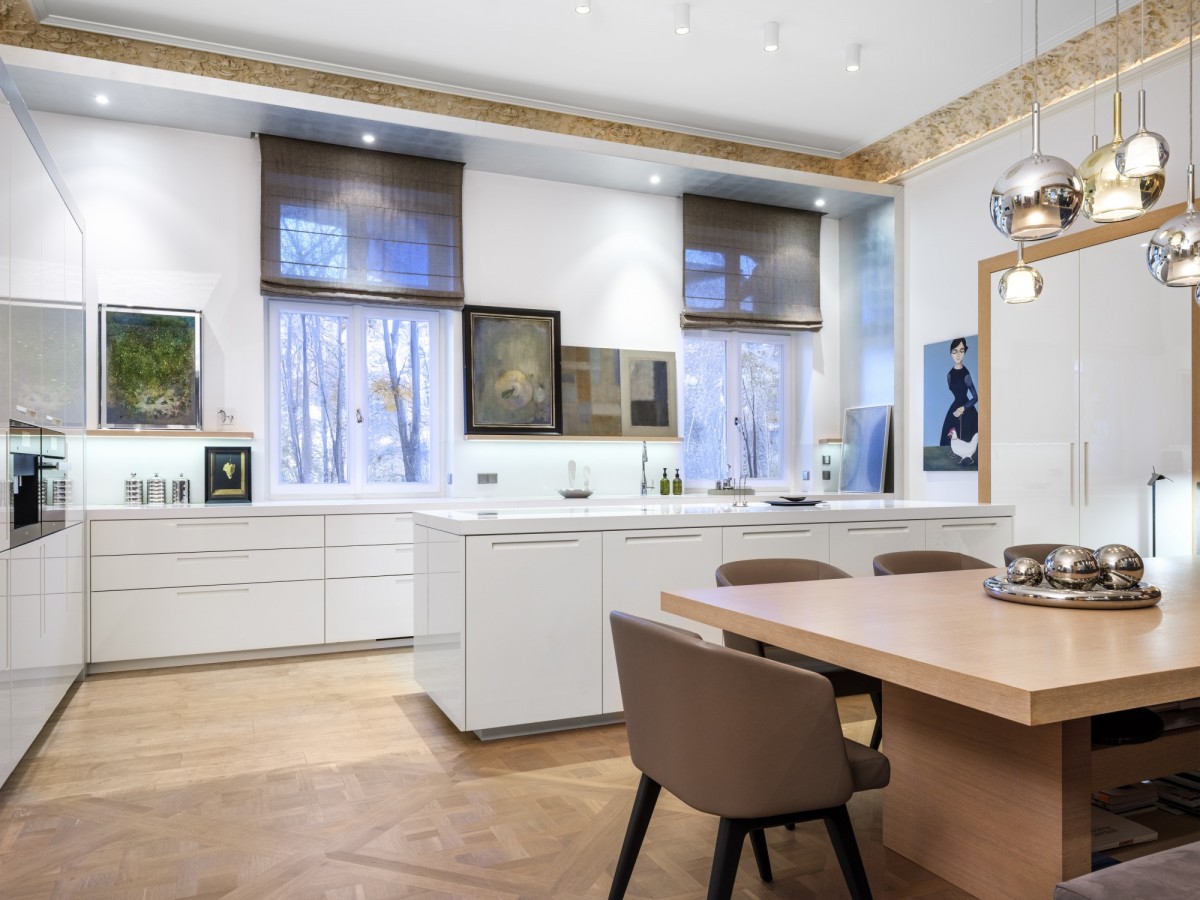 • kuchnię wykonaną na indywidualne zamówienie z najwyższej jakości materiałów i sprzętem marki Miele, z centralną wyspą i przestronną częścią jadalną