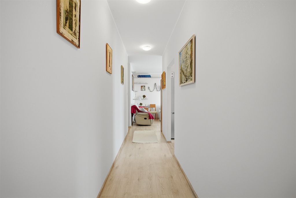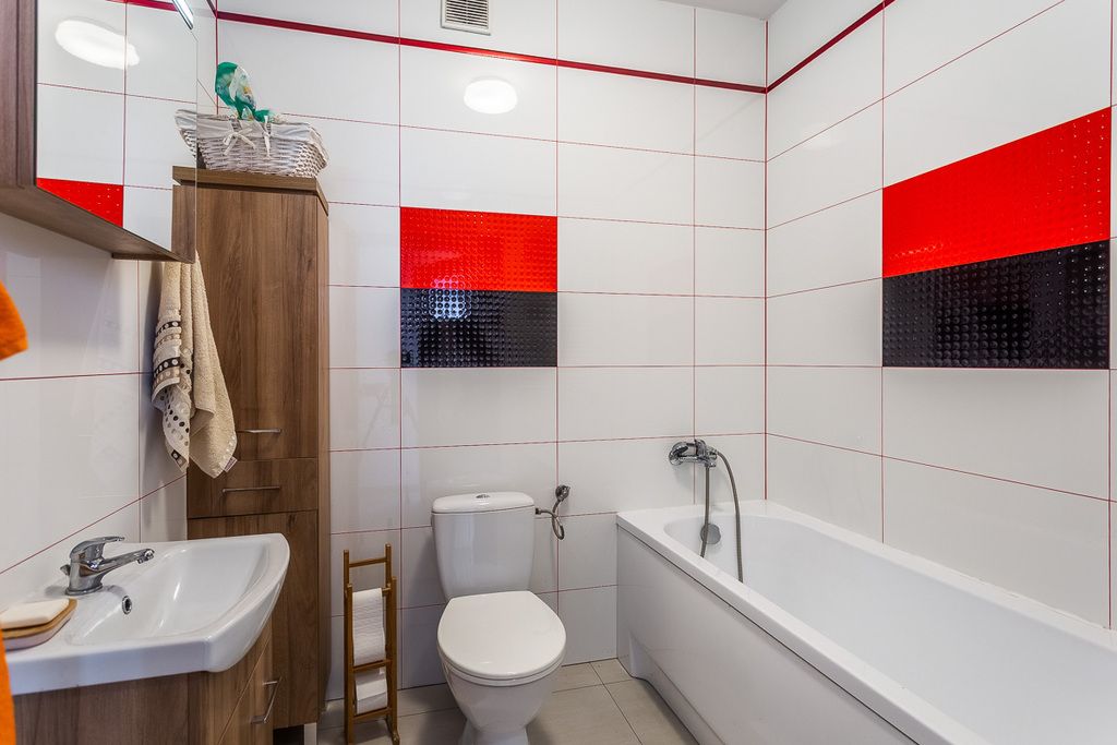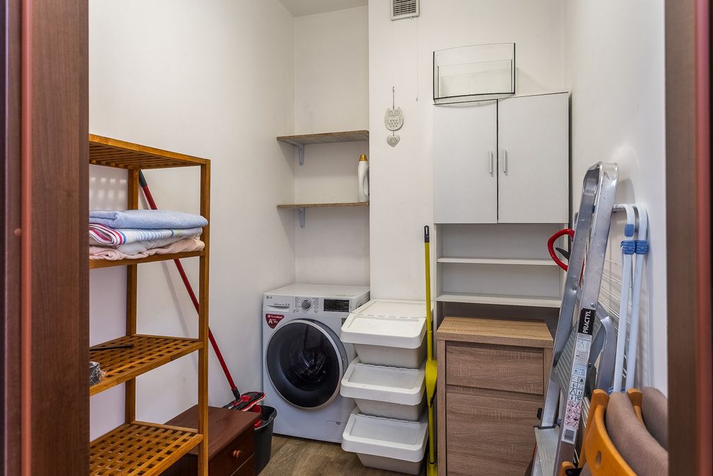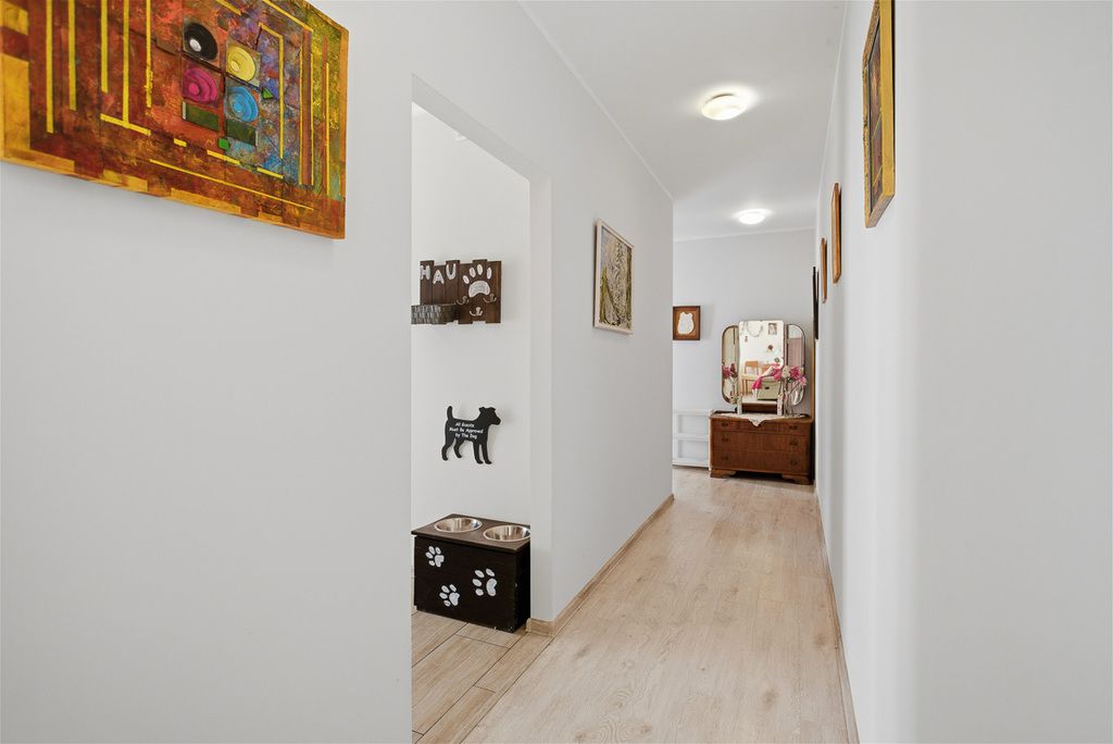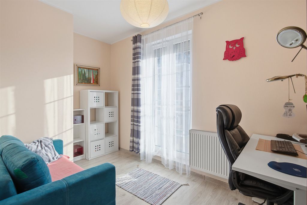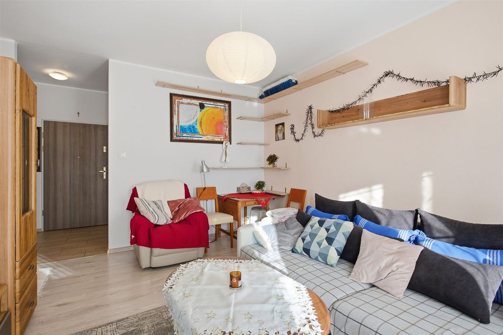 W skład mieszkania wchodzą trzy pokoje, widna kuchnia z pełnym wyposażeniem (meble w zabudowie, lodówka, zmywarka, okap, piekarnik, mikrofalówka, płyta grzewcza elektryczna, zlewozmywak, zamrażarka), łazienka z wanną, umywalką, WC i grzejnikiem drabinkowym oraz garderoba. Podłogi wyłożone są panelami, co zapewnia przytulny klimat.