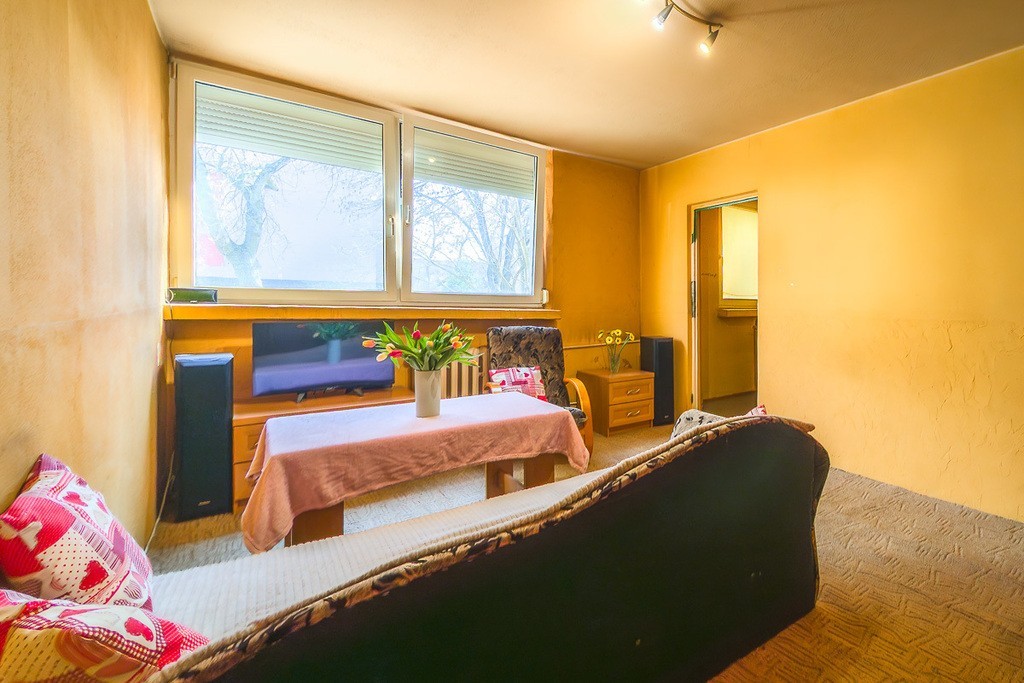 Mieszkanie z pokojem (17 m²) przechodnim i widną kuchnią wyposażoną w meble, lodówkę, gazową płytę grzewczą oraz zlewozmywak. Łazienka z wanną i WC. Okna wychodzą na wschód, wyposażone są w rolety antywłamaniowe oraz kraty w oknie kuchennym, co podnosi poziom bezpieczeństwa. Drzwi wejściowe są drewniane. Podłogi wykończone PCV. Ogrzewanie miejskie, ciepła woda z wodociągu miejskiego. Mieszkanie wymaga kapitalnego remontu oraz wymiany instalacji, co daje możliwość aranżacji według własnych potrzeb.