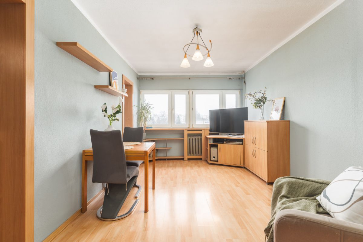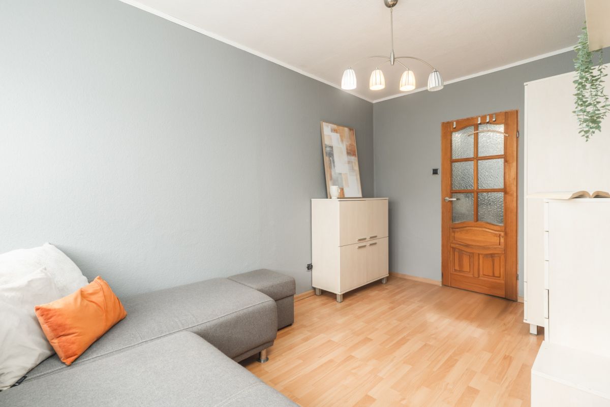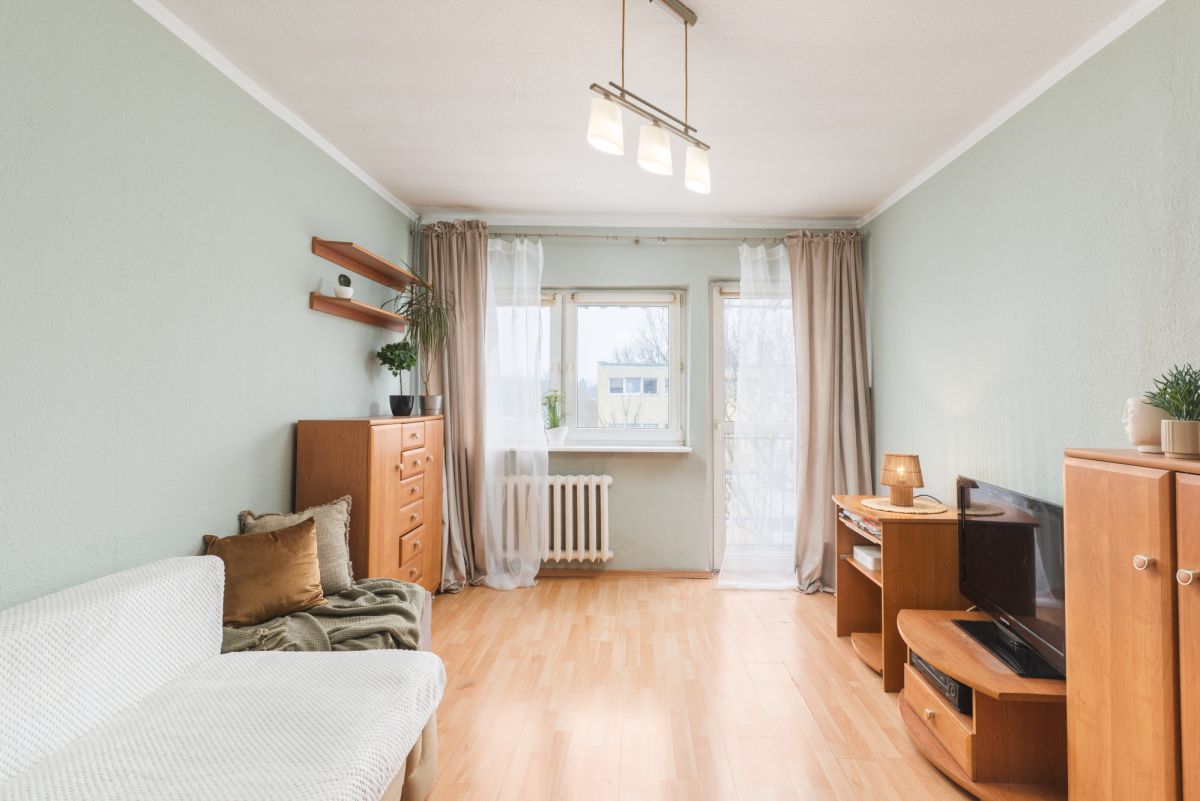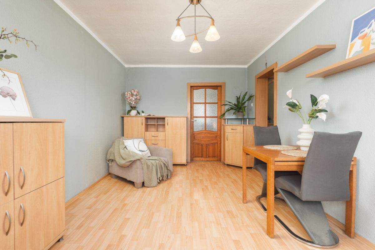 Mieszkanie jest bardzo ciepłe i przytulne. Co prawda wnętrze nosi ślady upływu czasu, świadczy o tym choćby stan podług czy pokryte farbą tapety na ścianach, ale jak najbardziej mieszkanie nadaje się do zamieszkania, a remont można odwlec w czasie.