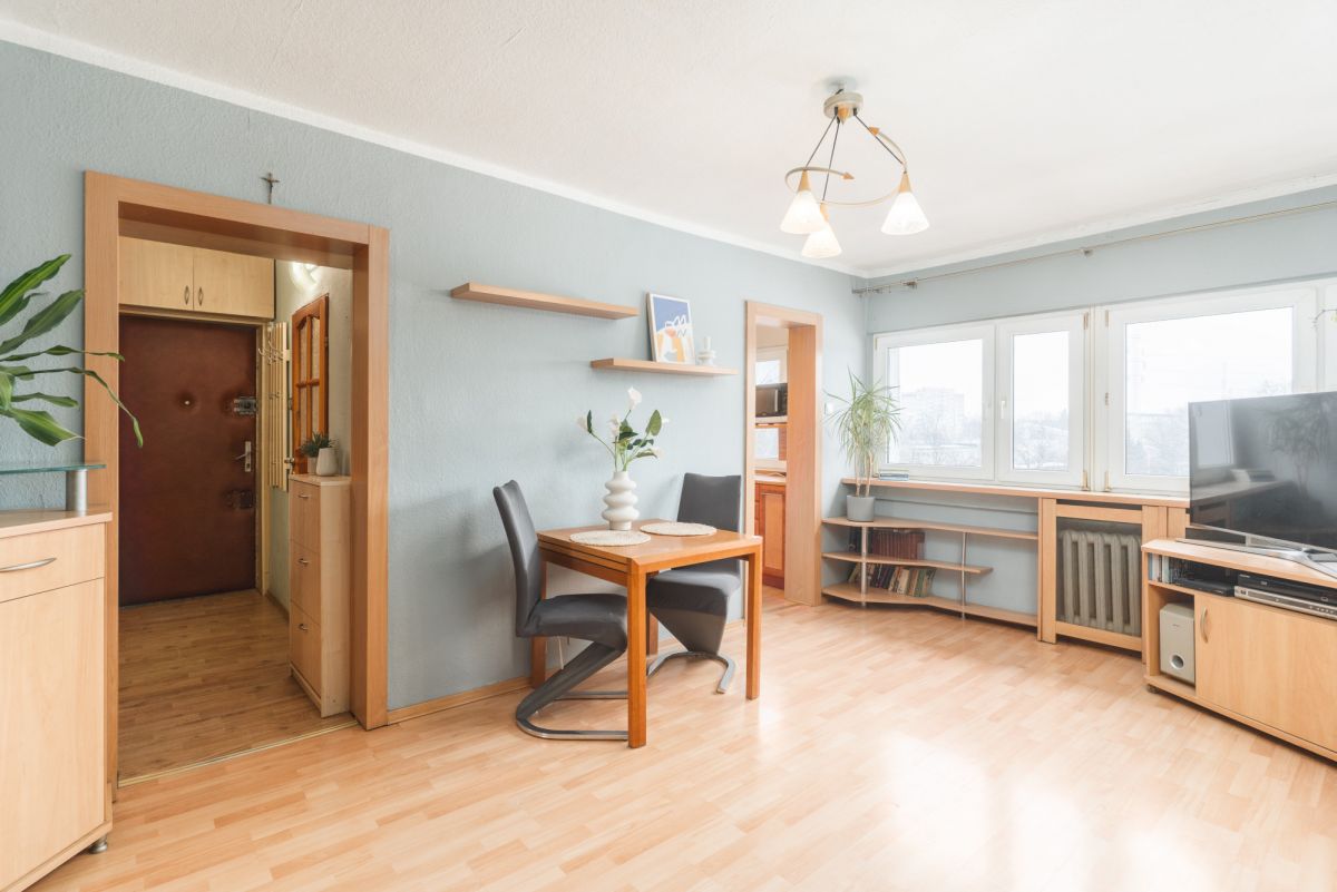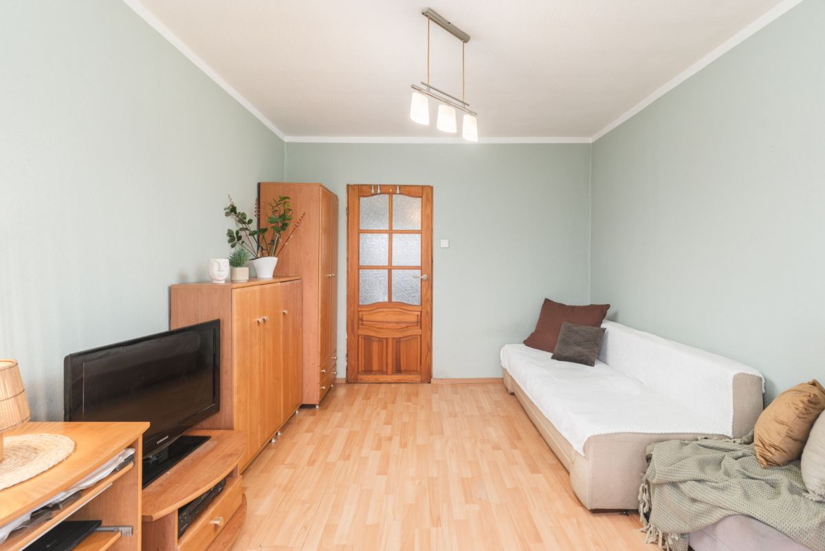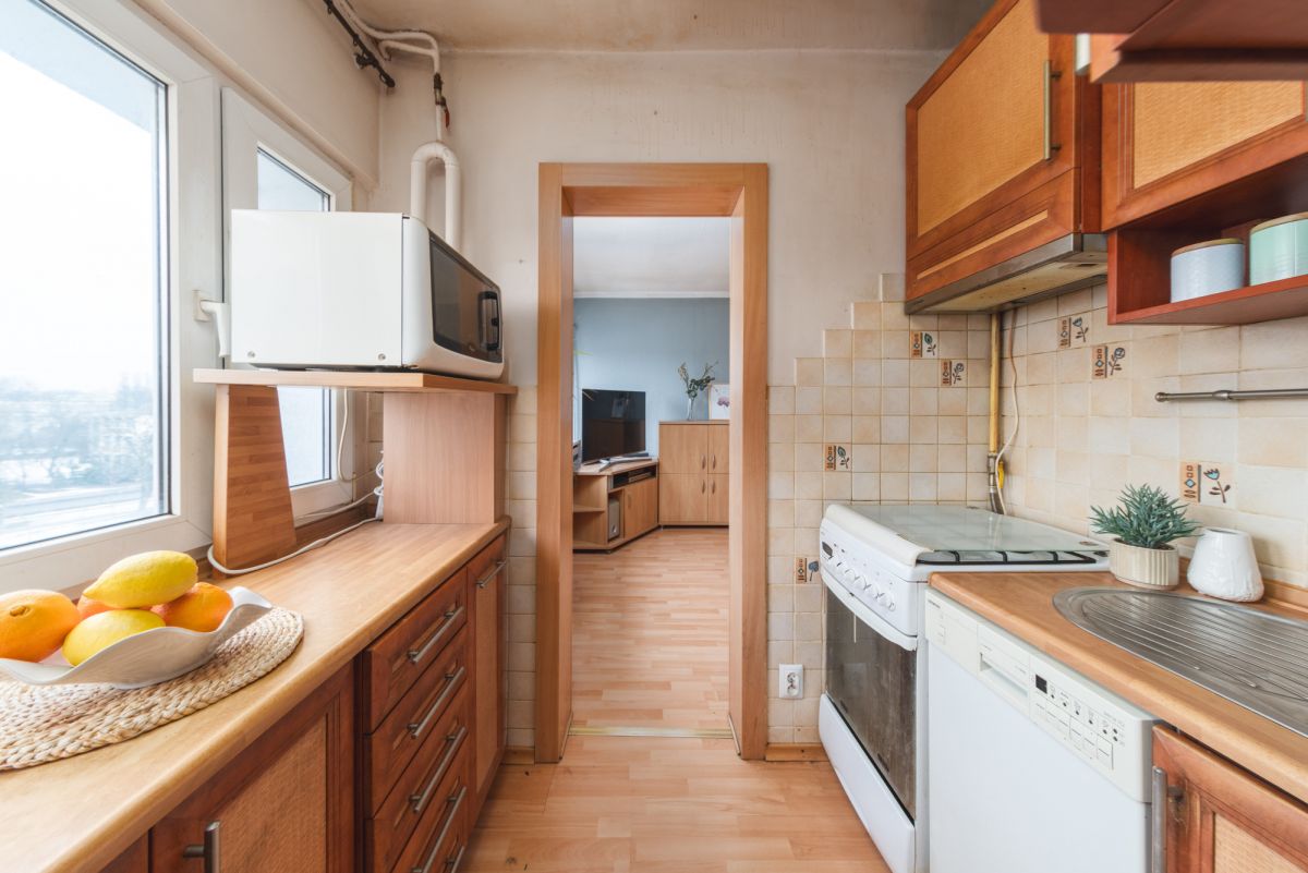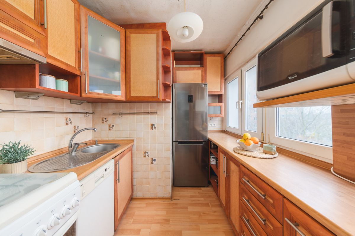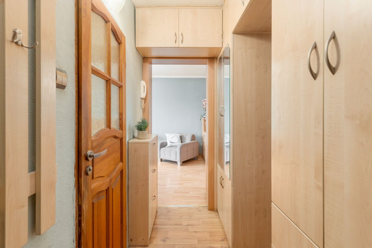 Mieszkanie jest bardzo ciepłe i przytulne. Co prawda wnętrze nosi ślady upływu czasu, świadczy o tym choćby stan podług czy pokryte farbą tapety na ścianach, ale jak najbardziej mieszkanie nadaje się do zamieszkania, a remont można odwlec w czasie.
